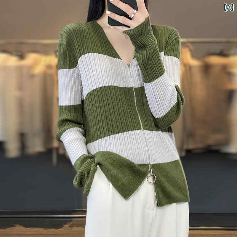 レディース カジュアル トップス おしゃれ 春 女性用 V ネックカーディガン シンプル 対照的 色 ダブル ジッパー 薄手 快適 シャツ ウール