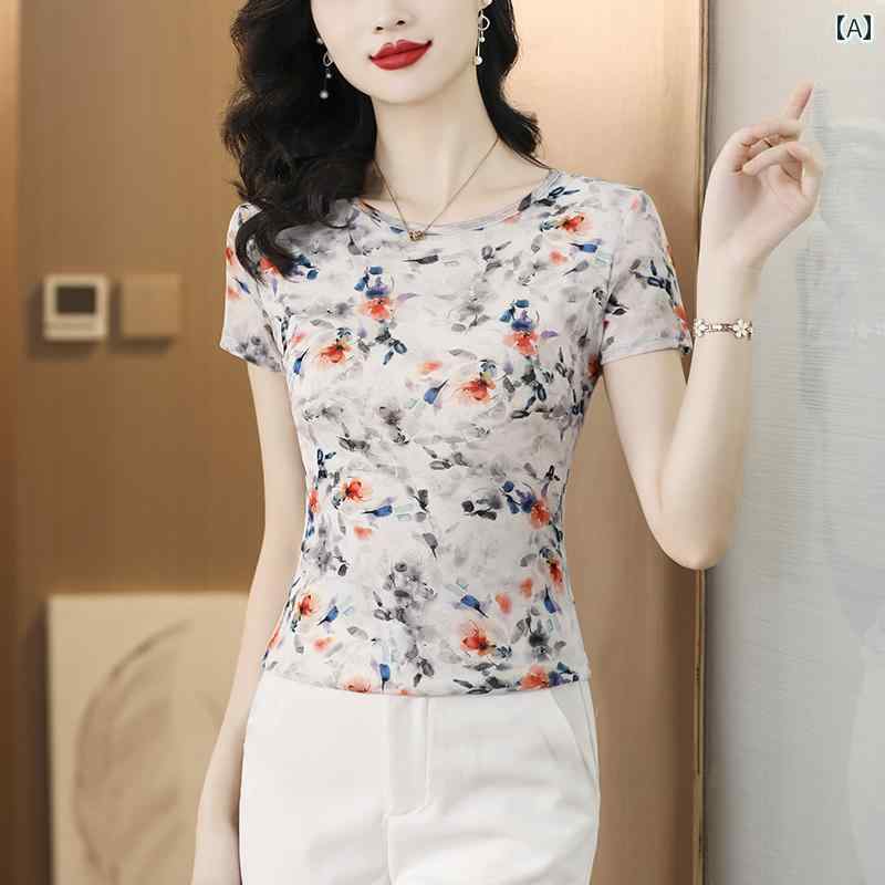 レディース トップス マザーズ 婦人服 普段使い 女性用 韓国 ラウンドネック サマー メッシュ 半袖 T シャツ 大きめ サイズ ママ ウェア プリント スリムフィット ウエスタンシャツ
