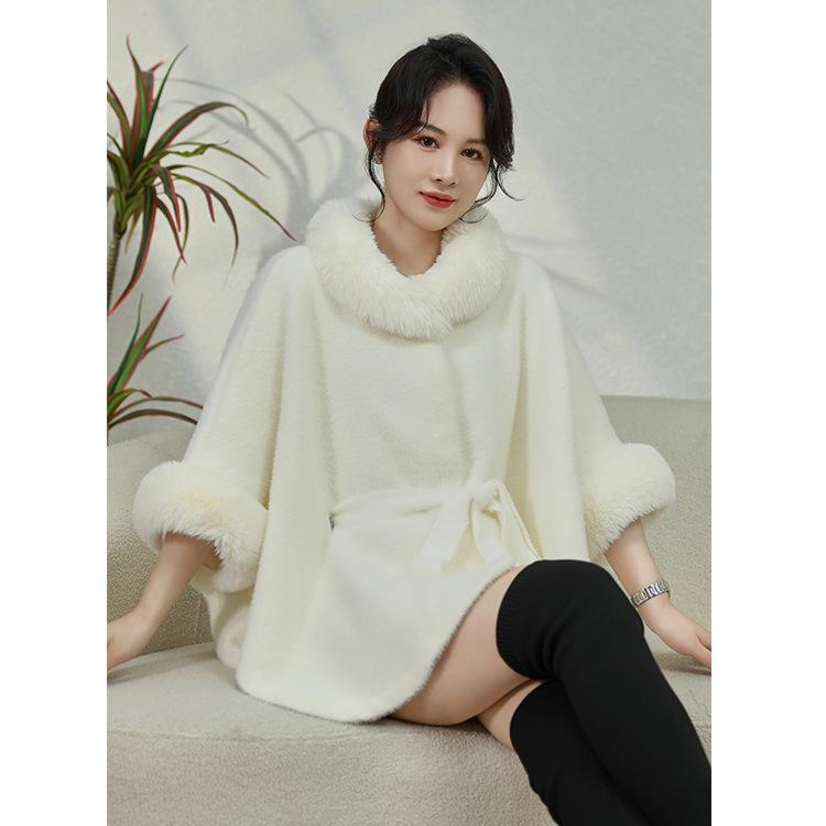 ポンチョ レディース 秋冬 高見え フェイクファー 付け襟 ウエストマーク 韓国 ファッション エレガント ニット ケープ 白色 黒色 ピンク系 赤色 防寒 あったか ショール ストール