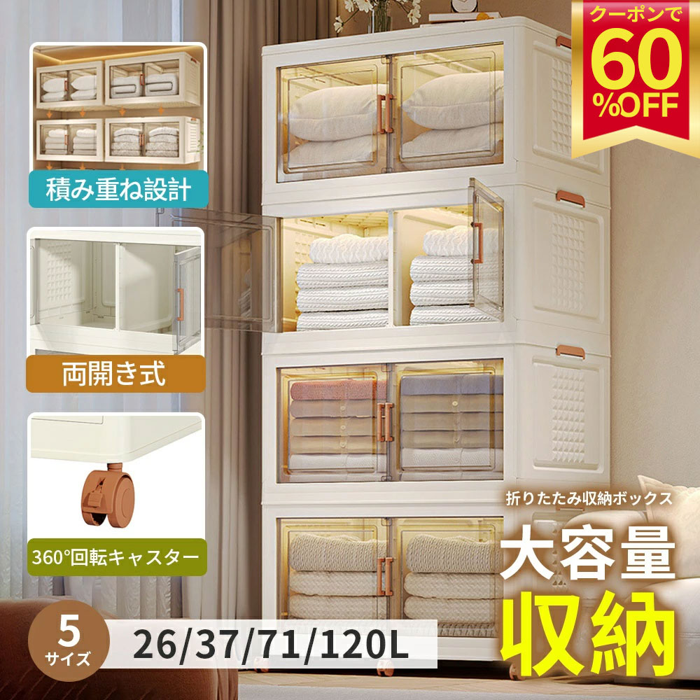 収納ボックス 折り畳み式 両面展開 扉付き 収納キャビネット キャスター付き 折り畳み 中身が見える 磁気吸着ロック コンテナ ボックス組立簡単 積み重ね 省スペース 高耐荷重 折りたたみ衣装ケース 押し入れ 衣物収納 半透明 ホワイト大容量 防塵 防湿 無臭