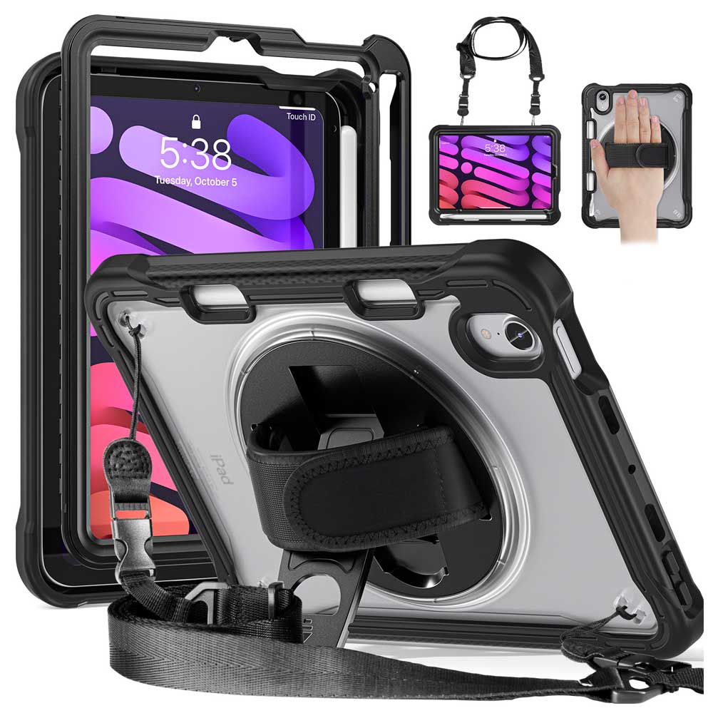 工事現場最適360度 回転 ハンドベルト iPad Mini 6 Mini 7 ケース 縦置き 横置き スタンド ショルダーGフック式ハンドストラップ付き iPad mini 第6世代 /iPad mini A17 Pro カバー 肩掛け 斜め掛け ペン収納 耐衝撃 TPU+PC 半透明カバー 頑丈 土砂汚れ防止