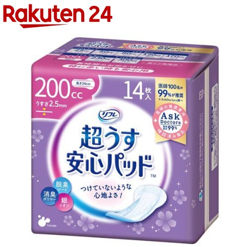 お店TOP>介護>おむつ・失禁対策・トイレ用品>尿とりパッド>尿とりパッド全部>リフレ 超うす安心パッド 特に多い時も快適用 200cc【リブドゥ】 (14枚入)【リフレ 超うす安心パッド 特に多い時も快適用 200cc【リブドゥ】の商品詳細】●超うす2.5mmでつけていないような心地よさ!●超うすなのに、安心の吸収力。●超うす吸収体で、驚きのうすさと高い吸収性能を両立。●圧倒的なつけ心地の良さを実感していただけます。●お肌へのやさしさにも配慮:弱酸性さらさら素肌シートを採用し、さらっとしたつけ心地。●トリプル効果でしっかり消臭:3方向から気になるにおいに対処するので、人と会うときも安心。●横モレ安心ガードがお肌にフィット:不意の尿モレも、サイドギャザーがしっかりガードしてモラしません。●コンパクトで携帯に便利:超うす型のパッドなので、ポーチにもすっきり。●個包装のデザイン:携帯時や使用時の抵抗感を和らげる女性らしいデザイン。●医療費控除対象商品【規格概要】品名:大人用紙おむつ(軽度失禁用)★サイズ寸法:巾13cm*長さ29cm薄さ:2.5mm吸収量:200cc★素材表面材:ポリエチレン/ポリエステル不織布吸水材:高分子吸水材/吸水紙防水材:ポリエチレンフィルム止着材:スチレン系エラストマーなど伸縮材:ポリウレタン糸結合材:スチレン系エラストマーなど【注意事項】★使用上の注意・汚れたパッドは早くとりかえてください。・テープは直接お肌につけないでください。・誤って口に入れたり、のどにつまらせることのないよう保管場所に注意し、使用後はすぐに処理してください。・パッドがお肌に合わない場合には、ご使用を中止し、医師にご相談ください。★保管上の注意・開封後は、ほこりや虫が入らないよう、衛生的に保管してください。★その他の注意・汚れた部分を内側にして丸めて、不衛生にならないように処理してください。・トイレにパッドを捨てないでください。・使用後のパッドの廃棄方法は、お住まいの地域のルールに従ってください。・外出時に使ったパッドは持ち帰りましょう。【原産国】日本【ブランド】リフレ安心パッド【発売元、製造元、輸入元又は販売元】リブドゥコーポレーションリニューアルに伴い、パッケージ・内容等予告なく変更する場合がございます。予めご了承ください。リブドゥコーポレーション541-0048 大阪府大阪市中央区瓦町1-6-10 JPビル0120-271-361広告文責:楽天グループ株式会社電話:050-5577-5043[大人用紙おむつ 失禁用品/ブランド:リフレ安心パッド/]