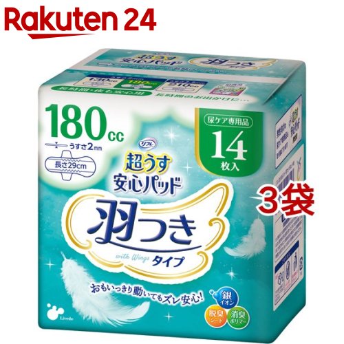 お店TOP>介護>おむつ・失禁対策・トイレ用品>尿とりパッド>尿とりパッド女性用>リフレ 超うす安心パッド 羽つきタイプ 女性用 長時間・夜も安心 180cc (14枚入*3袋セット)【リフレ 超うす安心パッド 羽つきタイプ 女性用 長時間・夜も安心 180ccの商品詳細】●おもいっきり動いてもズレ安心!●下着に固定!羽つきだから動いても!●超うす2mmで、つけていないような心地よさ♪●長さ29cmの女性用。●超うすなのに、安心の吸収力。●超うす吸収体で、驚きのうすさと高い吸収性能を両立。●圧倒的なつけ心地の良さを実感。●お肌へのやさしさにも配慮:弱酸性さらさら素肌シートを採用し、さらっとしたつけ心地。●トリプル効果でしっかり消臭:銀イオン・脱臭シート・消臭ポリマーが気になるにおいに対処!●横モレ安心ガードがお肌にフィット:不意の尿モレも、サイドギャザーがしっかりガードしてモラしません。●医療費控除対象品【リフレ 超うす安心パッド 羽つきタイプ 女性用 長時間・夜も安心 180ccの原材料】・表面材:ポリエチレン/ポリエステル不織布・吸水材:高分子吸収材/吸水紙・防水材:ポリエチレンフィルム・止着材:スチレン系エラストマーなど・伸縮剤:ポリウレタン糸・結合材:スチレン系エラストマーなど【規格概要】サイズ:巾13cm*長さ29cm、薄さ2mm、吸収量目安:180cc【注意事項】★使用上の注意・汚れたパッドは早くとりかえてください。・テープは直接お肌につけないでください。・誤って口に入れたり、のどにつまらせることのないよう保管場所に注意し、使用後はすぐに処理してください。・パッドがお肌に合わない場合には、ご使用を中止し、医師にご相談ください。★使用後の処理・汚れた部分を内側にして丸め、不衛生にならないように処理してください。・トイレにパッドを流さないでください。・使用後のパッドの廃棄方法は、お住まいの地域のルールに従ってください。・外出時に使ったパッドは持ち帰りましょう。★保管上の注意・開封後は、ほこりや虫が入らないよう、衛生的に保管してください。【原産国】日本【ブランド】リフレ安心パッド羽つき【発売元、製造元、輸入元又は販売元】リブドゥコーポレーション※説明文は単品の内容です。リニューアルに伴い、パッケージ・内容等予告なく変更する場合がございます。予めご了承ください。・単品JAN:4904585045387リブドゥコーポレーション541-0048 大阪府大阪市中央区瓦町1-6-10 JPビル0120-271-361広告文責:楽天グループ株式会社電話:050-5577-5043[大人用紙おむつ 失禁用品/ブランド:リフレ安心パッド羽つき/]
