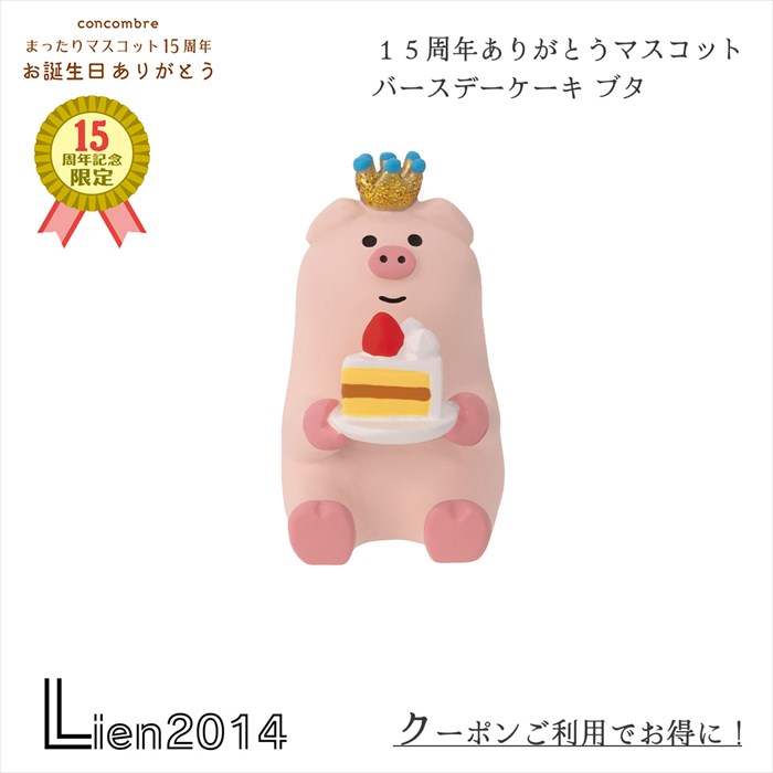 コンコンブルまったりマスコットが発売から15周年を迎えました!黒猫・ブタ・かえる・パンダの4種類からスタートしたコンコンブル。15周年を記念してスペシャルな限定品が発売です!初期メンバー4人が当時のポーズでリニューアルした復刻版がBOX入りで登場♪王冠を被ったマスコットや15周年の誕生日をお祝いするマスコットも盛りだくさん。15周年限定商品は完全限定生産なので、ぜひこの機会をお見逃しなく!クーポン利用でお得にゲット♪デスクや玄関先に飾ったり、リビングのインテリアにしてもOK。大きさは小ぶりなので、デスクに置いても邪魔になりません。concombreの仲間たちと一緒に飾ってストーリーを楽しんでみてはいかが?商品名:15周年ありがとうマスコット バースデーケーキ ブタ素材:ポリレジン製サイズ:約幅26×奥行34×高さ44mmデコレ商品についてこちらの商品は手作業による色付けの為、塗装ムラ・塗装剥がれ・塗装のはみ出し・小さな傷が見受けられる場合がございます。いずれもメーカー検品を通った良品となりますので、上記理由での返品・交換はお受けかねますので予めご了承ください。
