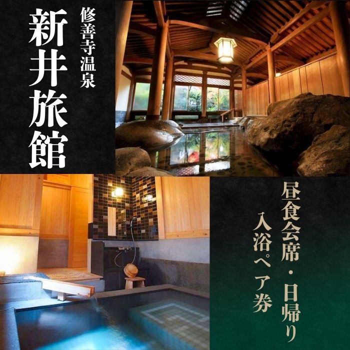 ― 返礼品詳細 ― 非日常空間の中で過ごす贅沢な日帰り旅行。 チェックイン11:30、チェックアウト14:00の2時間半。 時間内なら何度でも温泉入浴が楽しめます。 ご昼食はお食事処。 ご休憩は個室をご用意いたします。 当館自慢の文化財風呂「天平大浴堂」や貸切風呂が人気です。 返礼品名 新井旅館 日帰り入浴券 2名様(個室休憩・昼食会席膳付)[049-002] 内 容 日帰り入浴券 2名様分 ・伊豆修善寺温泉で過ごすプチセレブ昼食会席膳と入浴、個室休憩(昼食はお食事処でのご提供となります) ・チェックイン 11:30、チェックアウト 14:00 予約方法 事前にお電話でご予約をお願いいたします。(0558-72-2007) 宿泊除外日 毎週木曜日、4/28~5/6、8/8~8/21、11/15~12/7、12/25~1/11 ※上記以外の日も除外日となる場合がございます。詳細は新井旅館(0558-72-2007)へお問い合わせください。 有効期限 発行日より1年間 ※使用期限を過ぎた宿泊券はご利用いただけません。また、期限の延長もお受けできませんのでご注意ください 注意事項 ・必ず事前にお電話でご予約をお願いいたします。(0558-72-2007) ・お申し込み後、利用券をお届けいたします。 ・ご予約の状況により、ご希望日に添えない場合がございます。 ・利用除外日の詳細、お子様のご利用等ついては直接旅館にお問合せください。 ・入湯税等、別途費用がかかる場合がございます。 ・利用券は必ずお持ちください。ご持参なしの場合、事由にかかわらずサービスのご提供ができません。(規定の料金をご請求させていただきます) ・その他優待券、割引券との併用不可。また、利用券の払戻等はできません。 提供元 有限会社 新井旅館 TEL:0558-72-2007 ・寄付申込みのキャンセル、返礼品の変更・返品はできません。 あらかじめご了承ください。 ・ふるさと納税よくある質問はこちら エリア 静岡県 伊豆市 静岡 伊豆 伊豆地方 izu / 日本 国内 東海 東海地方 中部 中部地方 関連キーワード 新井旅館 国 登録文化財 個室休憩 個室 昼食 会席 御膳 日帰り 入浴 入浴券 ペア券 利用券 券 ペア 2名 温泉 露天風呂 貸し切り 貸切 温泉宿 宿 旅館 ホテル 旅行 非日常 空間 贅沢 / 楽天市場 楽天 ふるさと納税 楽天ふるさと納税 ふるさと 39ショップ お買い物マラソン スーパーセール 送料無料静岡県 伊豆市 修善寺温泉 『 新井旅館 日帰り入浴券 』 2名様(個室休憩・昼食会席膳付) ■受領証明書及びワンストップ申請書のお届けについて 受領書とワンストップ申請書については、自治体概要のページ(配送について)をご覧ください。
