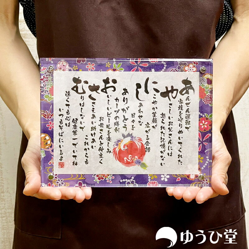 事前確認が不要(発送後の確認でOK)の場合は最短のお届けが可能です。 商品名 古希祝い専用の名前詩『名前詩 古希 SSサイズ』1名様フルネームもしくは2名様 用途 古希祝いの贈り物や記念品として 額縁サイズ SS(200ミリ×150ミリ) 額縁材質 国産高純度アクリル 額縁の装飾 友禅和紙15種類 ちぎり絵(墨絵) 全38種類 納期 事前確認が不要(発送後の確認でOK)の場合は最短のお届けが可能です。 事前確認が必要の場合は、お届け日を指定されてもご対応は出来かねます。 『事前確認が必要』で『最短のお届け日設定』をされた場合は、状況によっては事前確認を省略して即日発送する場合がございます。 ラッピング 包装(無料) 熨斗紙(無料) 商品説明 人生や生き方について、 感謝の気持ちや労いの心を 表現した素敵な詩を、 お一人様の氏名または、 お二人様の連名で制作します。 ※筆文字フォントは『京円』を使用しております。 ※文字数に制限はありません。 ※文字『頭ぞろえ』でも文字により文頭にならない場合もあります。 ※この商品は『手書き』『手ちぎり和紙』ではありません。※当商品は日本名前詩協会認定品です。 当商品は1名様フルネームもしくは2名様専用となっております。 お一人様用はコチラ古希祝いに紫色の名前詩はいかがですか? 古希祝いはなぜ紫色? 紫色はかつては貴重なもので位の高い人にだけ使用を許されていた色となります。 現代は長寿国家の日本でも、昔は50歳、60歳が終年の時代でした。 当時は70歳を迎える事はめったにない縁起事だったので、希少とされる紫色を 古希のお祝いに用いたとされています 紫色の友禅和紙で彩る感動の名前詩を贈られるのはいかがですか。 名前詩って何? 名前詩(なまえうた)とは名前を使用して作る詩のことです。 折句やあいうえお作文とも言われており その方にあったオリジナルの詩からは感動と涙と驚きと笑顔が生まれます。
