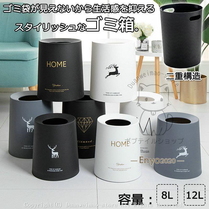 ゴミ箱 8L 12L 円形 キッチン リビング 鹿柄 ダイヤモンド柄 寝室 ダストボックス スリム ホワイト グレー ブラック 二重構造 シンプル 無地 北欧 おしゃれ