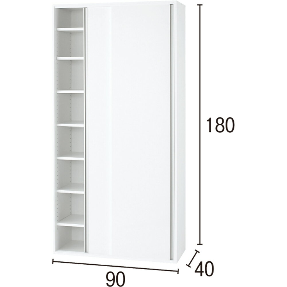 美しく全部隠せる、大量収納が可能な壁面収納書棚。光沢仕上げの前面の引き戸扉が高級感を与え、狭い空間でも省スペースの開閉を実現。設置場所を選ばないシンプルなデザインと、多彩なサイズバリエーションが人気の、おすすめの引き戸扉付き大量収納壁面収納庫です。扉の光沢が美しい、壁に溶け込むシンプルスライド扉収納庫◆文庫や新書、CD・DVDなど、どんどん増え続ける収納物をキレイすっきりと大量収納ができるブックシェルフラックです。◆引き戸のスライド式扉は、お手入れしやすく清潔感のある光沢素材を採用。◆雑多になりがちな本棚も、扉を閉じればすっきりと全部隠せ、まるで壁に同化しているような美しいただずまいとなります。◆取っ手はフラットタイプで、洗練されたシルバーアクセントに。◆棚板は中央1枚が固定棚で、それ以外の棚板は3cm単位の高さで調節できます。◆シンプルで飽きのこないデザインは、SOHOをはじめ、リビングルームやベッドルーム、子供部屋収納でもオススメです。◆CDラック・DVDラック・キッチンラックなど、用途もさまざま。◆シリーズには、奥行薄型・深型の2タイプ×幅3サイズ×各突っ張り式の上置きをラインナップ。◆シリーズを組み合わせれば、統一感ある天井いっぱいの壁面収納が完成します。◆あふれる収納物をすっきりと隠して収納できる国産のスライド本棚、ぜひお試しください。ページ下部に画像の説明がございます。一部別売りの商品もございますので、説明文ご確認のうえご注文ください。>画像の説明はこちら<仕様・サイズ■サイズ:幅90奥行40高さ180・重さ49kg、上置き設置時の天井対応高さ235〜250cm■前面…ポリエステル化粧合板(光沢仕上げ)、天板・側面…化粧合板■可動棚板12枚付き■棚板耐荷重(1段当り)約20kg■日本製【組み立て時間約40分】【送料マーク:E】 梱包サイズが大きいため、お部屋まで搬入できない場合があります。ご注文の際は、必ず事前に梱包サイズと設置場所までの搬入導線(通路の幅・高さ等)をご確認ください。>詳細な説明はこちら<この商品の配送料は7000円(税込)です。※北海道・九州・沖縄は地域特別配送料がかかります。この商品は下記のサービスが選択できます。※組み立て・開梱サービスは日時指定ができません。お届け前に配送所より配達日時のご連絡をさせていただきます。※別途配送料金がかかります。有料組み立てサービス※開梱サービス付きについて有料開梱サービスについて 画像の説明中央棚(左右1枚ずつ計2枚)は固定板です。その他左右6枚計12枚の棚板が可動します。コーディネート例 ※お届けは本体幅90奥行40cmです。コーディネート例 ※お届けは本棚幅90奥行40cmです。奥行40cmの深型は雑誌や辞書、書類の収納に。中央1枚を除く棚板可動式。3cmピッチで調節できます。前面は光沢が美しいポリエステル化粧合板を使用。きらめくツヤのあるホワイトがお部屋の清潔感を際立てます。棚板頑丈構造。少しの発想の転換で、荷重に強い仕様にしました。きれいな光沢扉。ほこりも避けられお掃除も簡単に。本だけでなく、季節家電や日用品なども困ったらここへ。【詳細図】