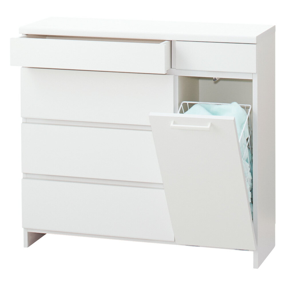 洗濯カゴと収納チェストがひとつになったアイデア商品洗濯カゴを扉の中に隠して収納できる、サニタリーチェストです。生活感が見えてしまう脱衣カゴや衣類、小物をこれひとつにまとめて収納できます。扉を閉めるとホワイトのすっきりした印象が際立つ、清潔感溢れるデザインです。洗面所周りの小物収納もおまかせ!天板下の引き出しは高さ8.5cm(内寸)で、使用頻度が高いタオル、パジャマ、小型家電をしまう場所にぴったり。フラップ扉隣の引き出しは高さ16.5cm(内寸)と深めで、バスタオルや衣類、シャンプーなどの小さいボトル類を収納するリネン庫としてもおすすめ。天板にお気に入りのアイテムを飾り、インテリアとしても楽しめます。チェストの奥行に合うカゴが付属奥行は30cm、42cmの2タイプから選べ、それぞれのサイズに合う洗濯カゴが付属します。奥行30cmタイプのカゴは、空間を圧迫しないコンパクトサイズ。(幅25cm×奥行25cm×高さ40cm)奥行42cmタイプのカゴは、奥行きがありたっぷり収納できます。(幅25cm×奥行38cm×高さ40cm)カゴは取り外し可能で、洗濯物を入れたまま持ち運べます。使い勝手の良いフラップ扉収納バスケットの引き出しは、手前に倒れるフラップ扉。開け閉めや衣類の取り出しがスムーズです。内側は美しい化粧仕上げ引き出し・フラップ扉の中は全て内部化粧をしており、衣類やタオルを清潔に保ちます。ストッパー付きの引き出しで安心!引き出し全段にストッパー付き。引き出しが抜け落ちる心配がないので、開ける時も安心感があります。限られたスペースにもフィットします脱衣所や洗面所などの限られたスペースに、チェストとバスケットを両方置けない方へおすすめです。湿気・水気が多い場所でも使いやすい設計収納カゴの下には高さ6cmのスペースがあり、体重計やスリッパ、サンダルをしまうことができます。湿気・水気が多いランドリールーム、サニタリールームでも、床との設置面が気にならず、お掃除もスムーズです。水に強い素材で、お手入れ簡単!前面・天板は水に強い素材を使用しており、お手入れが簡単。洗面台や洗濯機の横でも安心です。届いてすぐに使える安心の日本製日本製・組立不要の完成品なので、ご自宅に届いてからすぐにお使いいただけます。※扉の取っ手のみお客様取付ページ下部に画像の説明がございます。一部別売りの商品もございますので、説明文ご確認のうえご注文ください。>画像の説明はこちら<仕様・サイズ■サイズ:幅90 奥行30 高さ82cm・重さ26kg■引き出し内寸天板下(大):幅53 奥行24.5 高さ8.5cm天板下(小):幅24 奥行24.5 高さ8.5cmフラップ扉左:幅54 奥行24.5 高さ16.5cm■素材:前面・天板…ポリエステル化粧合板、側面…強化化粧合板、カゴ(25×25×40cm)…スチール■転倒防止金具付き■幅木カット(8×1cm)■お客様にて取っ手取付■日本製【送料マーク:D】 梱包サイズが大きいため、お部屋まで搬入できない場合があります。ご注文の際は、必ず事前に梱包サイズと設置場所までの搬入導線(通路の幅・高さ等)をご確認ください。>詳細な説明はこちら<この商品の配送料は5000円(税込)です。※北海道・九州・沖縄は地域特別配送料がかかります。この商品は下記のサービスが選択できます。※組み立て・開梱サービスは日時指定ができません。お届け前に配送所より配達日時のご連絡をさせていただきます。※別途配送料金がかかります。有料開梱サービスについて 画像の説明商品イメージ脱衣カゴ置き場と収納チェストとしてお役立ちします。フラップを閉じればすっきりした印象に。引出しは洗面所周りのタオルや小物を収納するのに便利です。引出しには大判のバスタオルやフェイスタオルがまとめて収納できます。フラップ内側まで美しい化粧仕上げ。手前に大きく開き、カゴの出し入れがスムーズ。引き出しはストッパー付きで、内部は化粧仕上げなので収納物をきれいに保ちます。前面と天板は水に強い素材を使っているのでお手入れが簡単です。