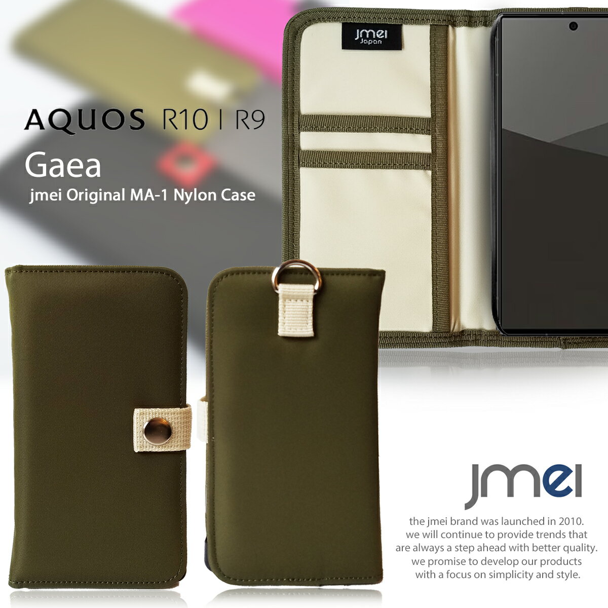 対応機種 AQUOS R10 SH-51F/AQUOS R9 SH-51E専用 アメリカ空軍のフライトジャケット「MA-1」をモチーフにしたデザイン。「MA-1」をイメージして開発したオリジナル 生地はナイロン+ポリエステル綿での3層構造で、この生地はとても軽く、ボンディング素材の柔らかな感触と2色使いのデザインが魅力です。 厳選されたカラーバリエーション 個性的で品のある4カラーをそれぞれ2色の配色で組み合わせています。表面と裏面で違う印象を与えるデザインです。ハンドル部分は2カラーの組合せによりより一層マッチするデザインです。 個性的なデザイン ケースの開閉にはスナップボタンを採用しています。誰でも容易に開閉ができます。背面には大胆なストラップリングをデザイン。お好みのストラップを装着できます。 落下防止 ケース背面部分はカメラホールをあえて開けずどんなシーンでもカメラを保護できるようになっています。うっかりスマホを落としてしまったりアクティブな場面でもカメラ部分をまもるようなっています。 二重の保護 フリップケースの薄さを保ちつつ、ホールドがあるため上部(液晶面に触れる)部分の浮きをなくし、端末をしっかり保護することを実現しています。内部にはスマートフォンを衝撃やホコリからまもってくれる端末専用のケース付きです。着脱が容易にできます。 ケースとファーのお手入れについて ・汚れがついた場合は乾いた布やブラシで軽くふき取ってください。 ・染色された他の物と長時間にわたって一緒に保管や接触すると色移りする可能性があります。 ・水分(雨・雪・汗)に長時間接触されたり摩擦が起こると変色する場合がございます。 ・過度の圧力をかけたり、強くこすったりすると、表面に傷をつける可能性があります。 ・汚れがついて乾ぶきでふき取っても落ちない場合は、消しゴムで落ちる場合がございますので、お試しください。AQUOS R9 SH-51E ケース JMEIオリジナルMA-1手帳ケース GAEA スマホケース 手帳型