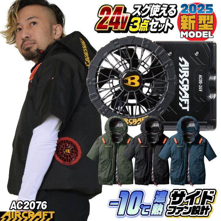 [即日発送] エアークラフト半袖ブルゾン+ファン+新型24V黒バッテリーセット AC2036 AC09シリーズ バートル BURTLE AIRCRAFT 2025年春夏新作