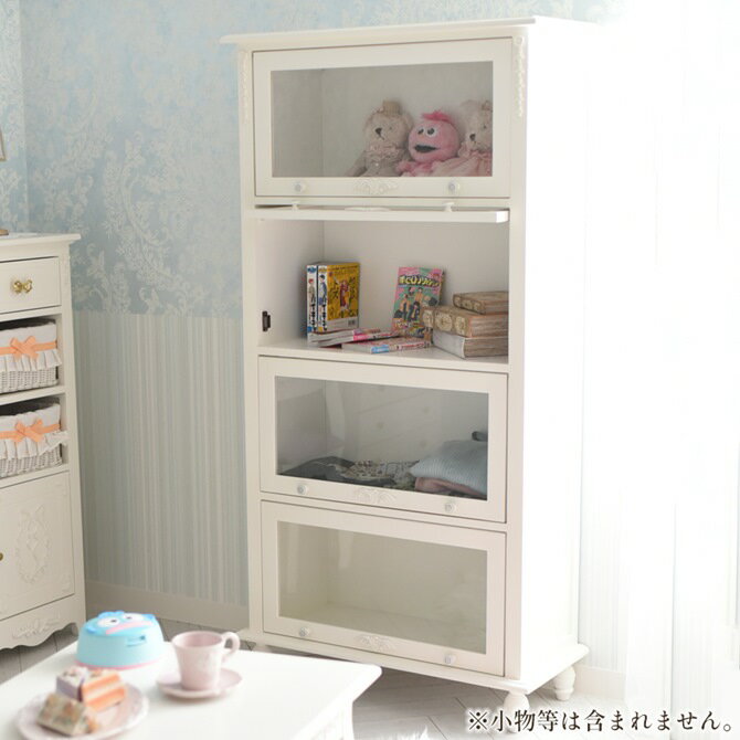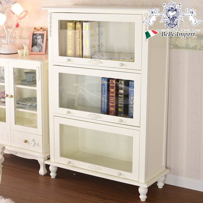 12/4(木)20:00〜【特別価格】 ▲2026年4月末入荷予定▲ プリンセス ロココ 調 スライド本棚 3段 完成品 アンティークホワイト おしゃれ 輸入家具 本棚 扉付 ヨーロピアン フレンチスタイル 収納 かわいい リボン 彫刻 飾り棚 ブックシェルフ ガラス扉