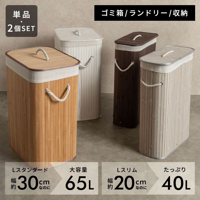 よく一緒に購入されている商品 ランドリーバスケット バンブーバスケット 持2,180円 収納 かご バスケット おしゃれ 持ち手付き1,580円~ ラタンで編まれた丸型コースター1枚 円形 丸270円 ■1個あたりのサイズ(cm) Lスタンダード:約W30 × D40 × H60 Lスリム:約W19 × D40 × H60 ※多少サイズは前後します。 ■1個あたりの容量 Lスタンダード:約 65L Lスリム:約 40L ■1個あたりの重量 Lスタンダード:約 1.7 kg Lスリム:約 1.5 kg ■素材 天然バンブー、ロープ ■生産国 中国 ■付属品 内布・フタ・底板・ワイヤー ■備考/お手入れ ・素材特有のにおいがすることがありますが、使用しているうちに自然とにおいは軽減されます。もし気になるようであれば、風通しの良い場所で1-2日陰干ししてください。 ■ご注意 ※ハンドメイドのためサイズ・形・色が写真と異なる場合があります。 ※重いものを入れると底が抜ける場合がございます。 ※天然素材のため素材独特の模様や斑点、また塗装の際にムラがでる場合があります。 ※竹のささくれがある場合はハサミなどでお切りください。 ※濡れたものは、絞ってから入れてください。 ※長期間、衣類などを入れて放置しておくと色移りする場合がございますのでお気を付けください。 ※商品によってガタつきがあったり、フタの遊びが大きい場合があります。 ※モニターの種類やパソコンの環境により、実際の商品のお色と若干異なる場合がございます。 商品コード[65300 65301 65302 65303 stc2-65300 stc2-65301 stc2-65302 stc2-65303 67212-br 67212-na 67212-wh 67212-gy] 類似商品はこちら ランドリーバスケット ランドリーワゴン ラン2,680円 ランドリーバスケット 折り畳み 折りたたみ 1,980円 ランドリーバスケット ランドリーワゴン ラン3,280円 ワイヤーバスケット ランドリーバスケット バ2,280円 ランドリーバスケット バンブーバスケット 持2,180円 ランドリーバスケット ランドリーバッグ ラン2,180円 ランドリーバスケット ランドリーワゴン ベー3,280円 ランドリーバスケット 大容量 ランドリーボッ4,900円~ ランドリーバスケット ワイヤーバスケット お2,780円新着商品はこちら2025/11/29 トレー お盆 木製 六角形 Mサイズ Ayu4,500円2025/11/29 トレー お盆 木製 六角形 Lサイズ Ayu5,500円2025/11/27 防水加工で湿った衣類もたくさん収納!4人家族1,890円再販商品はこちら2025/11/29 バスケット かご Mサイズ 2way シーグ1,980円2025/11/29 サイドテーブル 切り株 天然木 木製 ウッド14,800円2025/11/28 チークウッドの輪切りステージトレイ L-約1880円2025/11/30 更新 ランドリーバスケットやゴミ箱にもちょうどいい 竹の質感が美しいふた付き収納バスケット Lスタンダード 65L / Lスリム 40L [単品/2個セット] 大人気バンブーバスケットにスリムタイプが新登場!生活感を隠して、たっぷり収納できる大容量65Lの「Lスタンダード」と、スペースを有効活用できる幅約20cmのスリムタイプながら40Lの収納力が魅力の「Lスリム」の2サイズからお選びいただけます。 ふた付きなので、見せたくない物を隠してスッキリ収納可能。ランドリーバスケットやリビング収納、分別用ダストワゴン、お子様のおもちゃ収納など、あらゆるシーンで活躍します。 カラーはナチュラル、ブラウン、ホワイト、グレーの4色展開で、リビングや寝室、 玄関、洗面所など、さまざまな空間にすっと馴染みます。収納としての機能性と、インテリアのような美しさを兼ね備えたバンブーバスケットで、いつもの空間をより心地よく整えてみませんか。 濡れた洗濯物を入れる場合は、こちらのランドリーバスケットもおすすめです。 ※只今、[Lスタンダード 65L]と[Lスリム 40L]の 販売ページをご覧になっています。 Sスタンダード 19Lはこちら > 【近日発売予定】Sハーフ 10Lはこちら > 【近日発売予定】S浅型 10Lはこちら > ランドリーバスケット一覧はこちら > バス・トイレ用品一覧はこちら >
