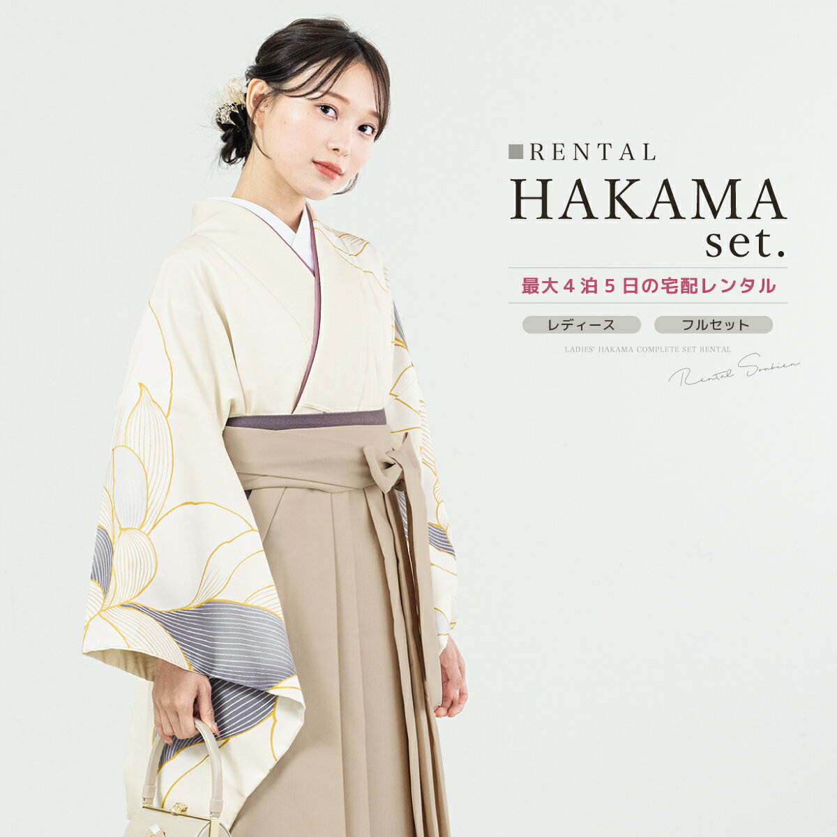 【スーパーSALE限定☆最大3000円クーポン配布中☆】【レンタル】袴セット 卒業式 袴 大学生 レディース フルセット 着物 クリーム ベージュ 蓮 花 絵羽柄 襦袢 帯 着物セット 140 150 160 170 創美苑 身長145から175cm対応 往復送料無料