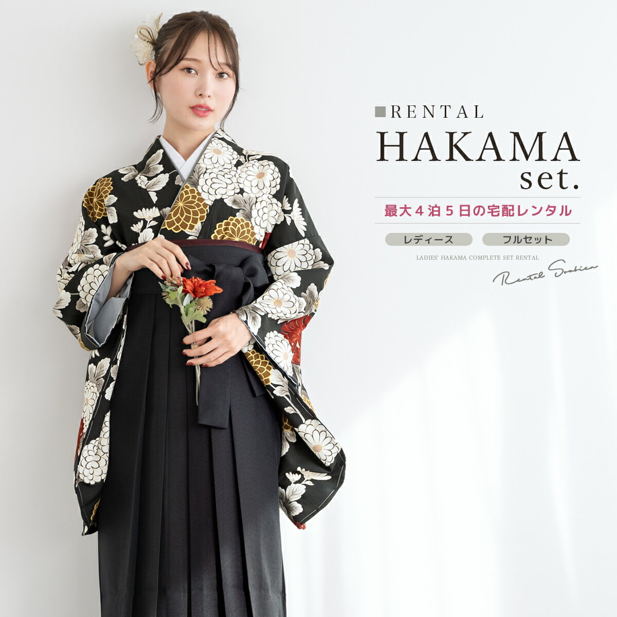 【スーパーSALE限定☆最大3000円クーポン配布中☆】【レンタル】袴セット 卒業式 袴 大学生 レディース フルセット 着物 ブラック 赤 黒 菊 花 着物 襦袢 帯 着物セット 140 150 160 170 創美苑 身長145から175cm対応 往復送料無料