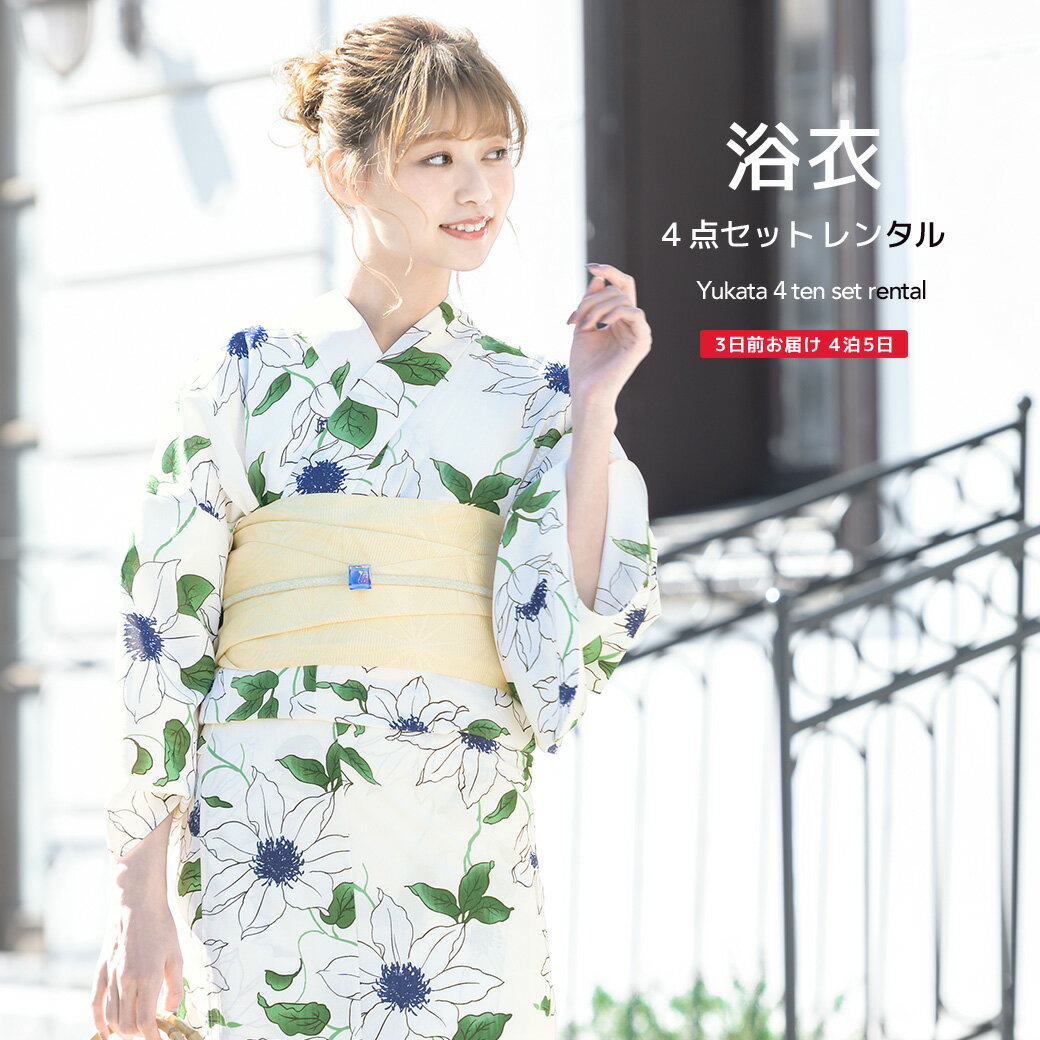 【スーパーSALE限定☆最大3000円クーポン配布中☆】【レンタル】浴衣 セット レディース レトロ 浴衣セット 大人 4点セット 白 ホワイト クレマチス 鉄線花 半幅帯 夏 クール ゆかた 女性 和服 往復送料無料
