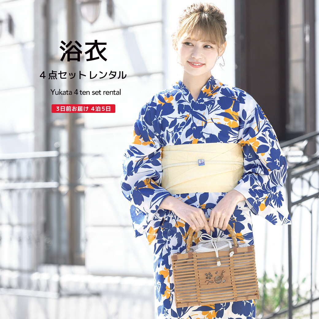 【スーパーSALE限定☆最大3000円クーポン配布中☆】【レンタル】浴衣 セット レディース レトロ 浴衣セット 大人 4点セット 白 ホワイト 青 ブルー オレンジ 橙色 花 半幅帯 夏 モダン ゆかた 女性 和服 往復送料無料