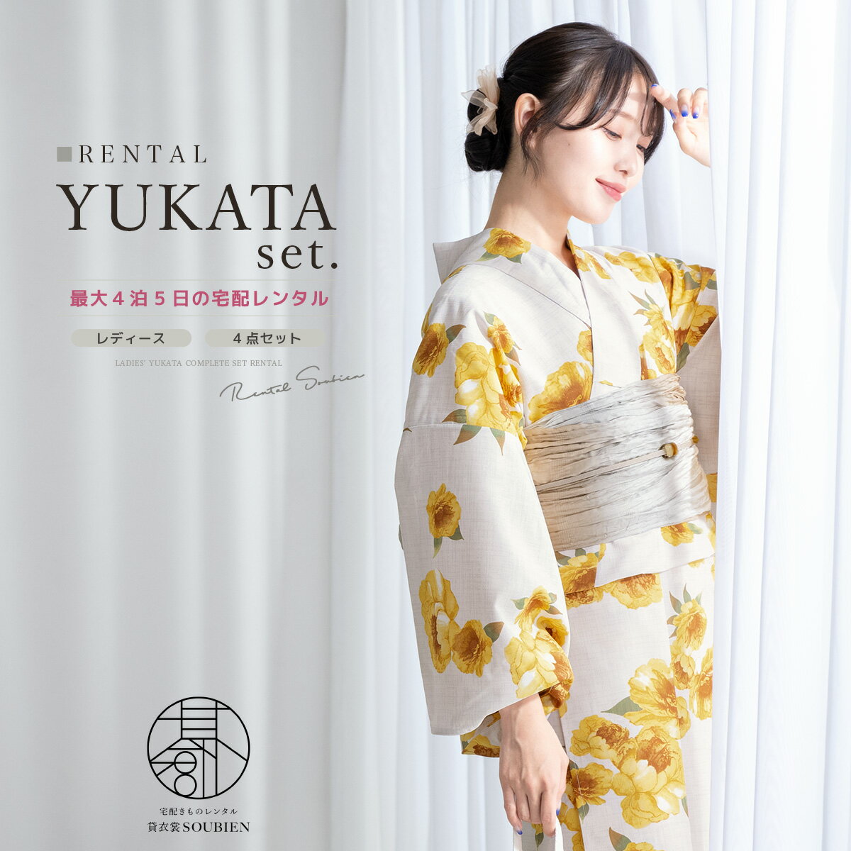 【スーパーSALE限定☆最大3000円クーポン配布中☆】【レンタル】浴衣 セット レンタル レディース 浴衣セット 大人 4点セット 夏 レトロモダン 女性 グレージュ系 黄色 イエロー 牡丹 花柄 兵児帯 往復送料無料