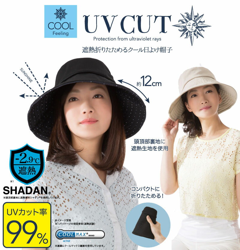 裏縁部分にCOOLMAX生地を使用しているので、涼しく快適!内側生地には遮熱生地を使用しているので、しっかりガード!内側には遮熱生地「シャダン」を使用しているので、ジリジリした日差しもカット。UVカット率99%だから、しっかりと紫外線をガードします。つばの長さは約12cmもあるつば広のデザインで顔全体だけでなく、気になる首筋までをしっかりガードします。小さく折りたたんでバッグにすっぽり収納できるので、旅行・お出かけやガーデニング、サイクリングなど外出時に便利です。 ●カラー/ブラック×ドット ●材質/ポリエステル100% ●サイズ/頭囲:約57.5cmまで