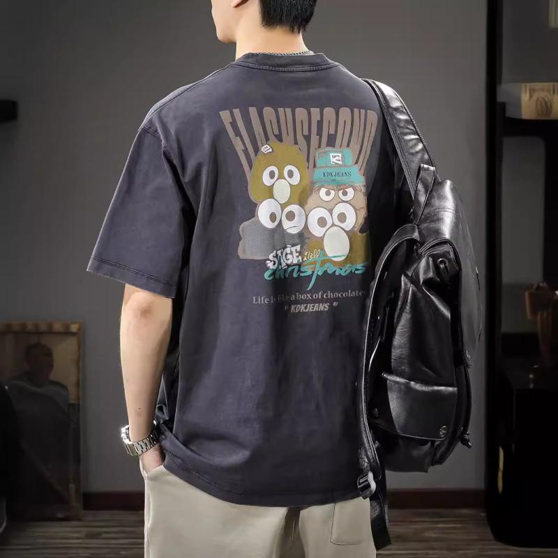 Tシャツ メンズ 夏 ヘビーウェイト 300g 日系 レトロ クルーネック 半袖 オーバーサイズ ゆったり カートゥーン プリント 綿 吸湿速乾 カジュアル