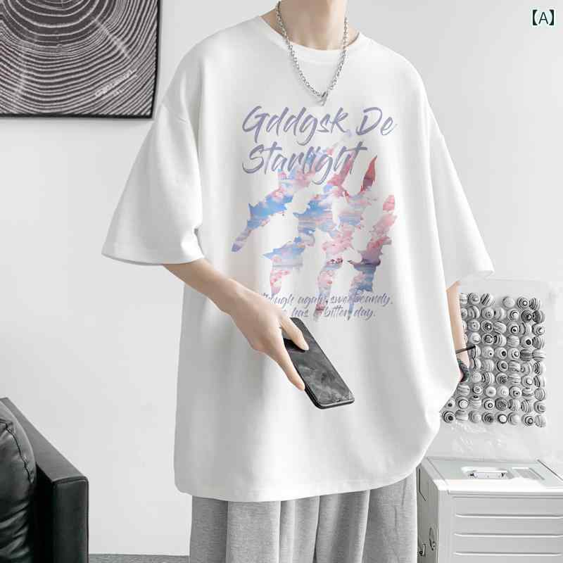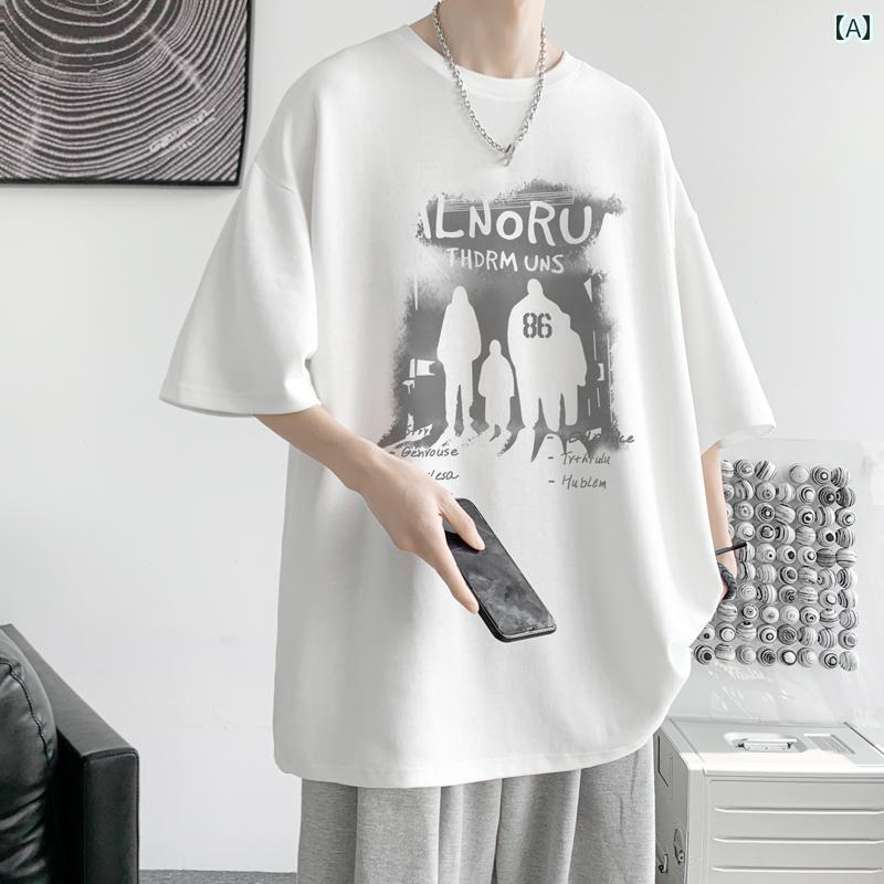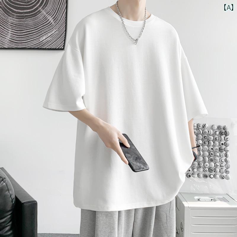 メンズ ストリート シャツ ウイグル 綿 300 g 厚手 半袖 Tシャツ 白 透けない 男女 カップル ゆったり 丸 首 レイヤリング シャツ