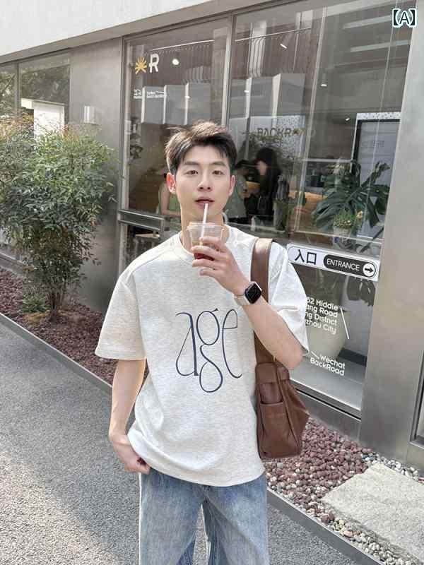 メンズTシャツ ワンポイント 300 g ホワイトと グレーの 文字 プリント ラウンドネック 半袖 Tシャツ メンズ 夏 2025 ゆったり カジュアル トップス