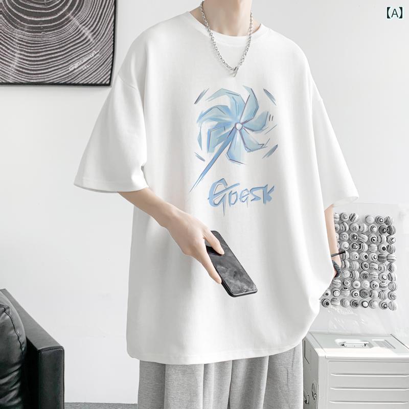 メンズ ストリート シャツ 300 G 厚手 コットン 半袖 Tシャツ メンズ 夏 風車 プリント 大きいサイズ ゆったり レイヤリング シャツ