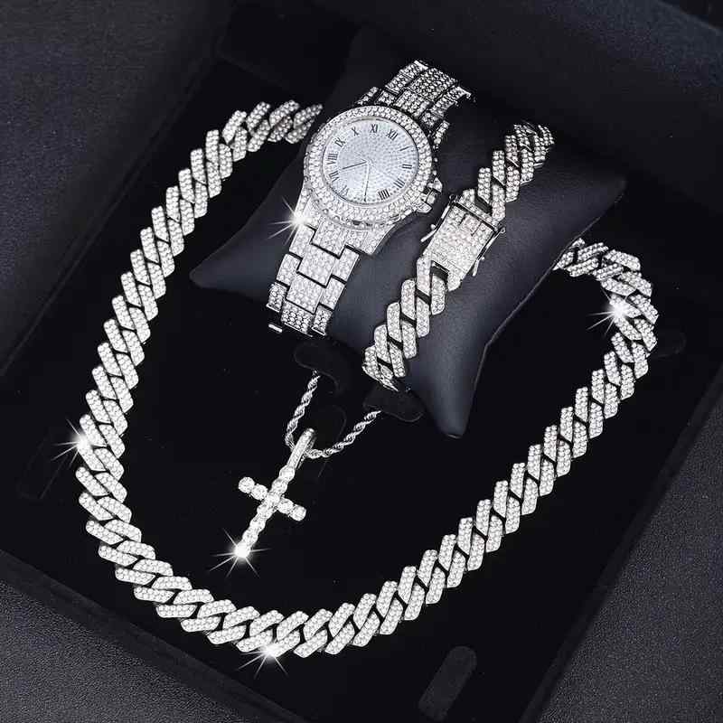 腕時計 男性用 ヒップホップ ウォッチ セット ジルコニア 装飾 キューバ ブレスレット ネックレス 合金 シルバー アクセサリー 普段使い