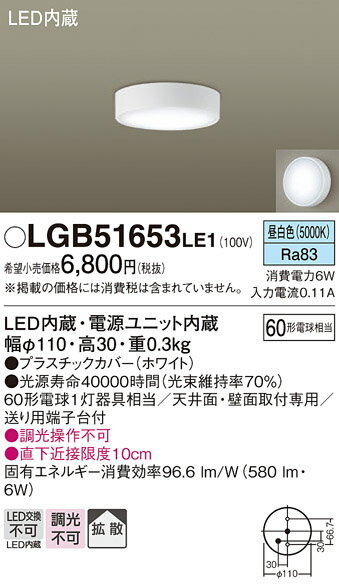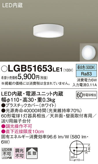 【仕様】●メーカー:パナソニック/Panasonic●型番:LSEB2070LE1●JANコード:4549980090343●60形電球1灯器具相当●商品サイズ:幅Φ110mm×高30mm●質量:6kg●光源色:昼白色●色温度:5000K●演色性:Ra83●消費電力:6W●入力電流:0.11A●器具光束:580lm●固有エネルギー消費効率:96.6lm/W●プラスチックカバー(ホワイト)●天井面・壁面取付専用●送り用端子台付●光源寿命:40000時間【ご注意】※直下近接限度は10cmです。※寿命は、全光束が初期の70%となる時間です。寿命は設計値であり、保証値ではありません。