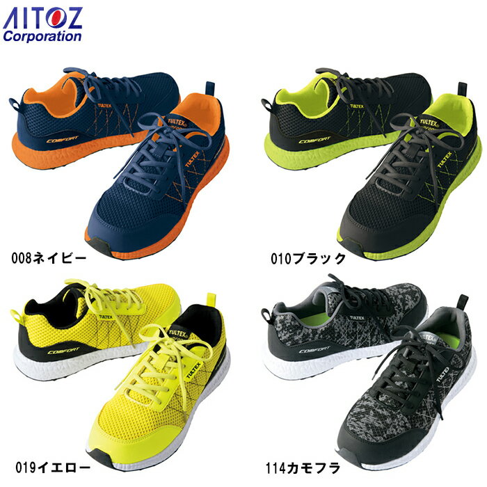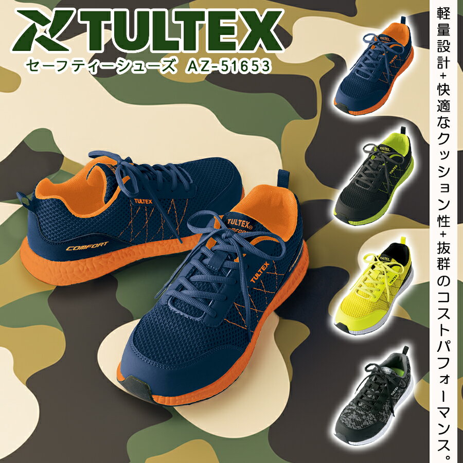 AITOZ AZ-51653 TULTEX セーフティシューズ [樹脂先芯、軽量、メッシュ、クッション性] 素材/甲被:合成皮革+ナイロンメッシュ、底:EVA+合成底、先芯:樹脂先芯 重量/330±10g(26cm 片足) ウイズ/EEE 軽量設計+快適なクッション性+抜群のコストパフォーマンス 26.0cm片足約330gの軽量設計。 ミッドソールのEVAによる安定感と快適なクッション性。 こだわりのカモフラ柄や人気の蛍光色を配したカラーバリエーション。 ムダのない設計が優れたコストパフォーマンスを実現。