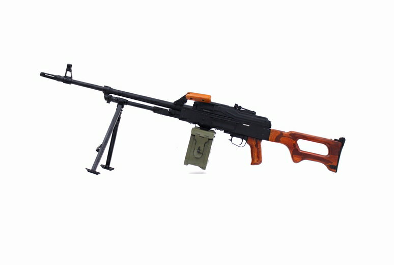 18歳以上対象商品 初速は0.98以下に調整されています銃刀法規制適合品 A&K製PKMメタル電動ガンのリアルウッドストック版 1つのバッテリーから本体とマガジンへ電力を分ける仕組みで、 BB弾の発射の動力とBB弾の自動巻き上げに使用されます。 ●全長:約1185mm ●重量:約7.5kg ●材質:メタル、リアルウッド ●初速: 約90m/s(HOPUP無しの場合) ●対応: 6mmBB弾 ●動力:9.6vバッテリーなど ●装弾数:約5000発 ※海外製の為、キズやムラの他に動作に調整の必要がある場合がございますので、知識ある方のみご購入ください。