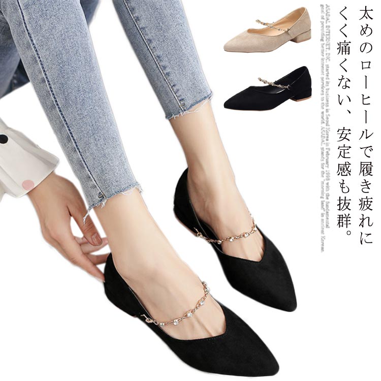 パンプス 痛くない レディース ローヒール 美脚パンプス ポインテッドトゥ 靴 22.5-24.5cm 太めヒール ぺたんこ フラット 歩きやすい ブーティー 疲れにくい カジュアル シンプル 可愛い 韓国ファッション 通勤 結婚式 パーティー
