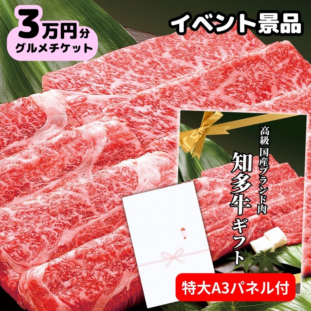 【イベント景品】高級牛すき焼き肉3万円コース券(特大A3パネル付/グルメカタログギフト風)結婚式 披露宴 二次会 ゴルフコンペ 景品 賞品 送迎会 ビンゴ大会「国産ブランド知多牛30000円分引換券」赤肉霜降りスライス しゃぶしゃぶ用 送料無料 牛肉のプロが選ぶ傑作。コンテストで何度も賞を取る国産ブランド牛肉「知多牛」スライスを、ギフトチケットでお届け。 【グルメな方にこそ、贈りたい】「食にこだわりのある方」にこそ味わっていただきたい、こだわりの国産ブランド牛肉「知多牛」スライスをお届け!流通の中間業者を徹底的に省き、「仲卸が直接販売するからこそ実現できる、品質の良さ」に自信があります!温度管理が難しいお肉だからこそ、もらった方がご在宅のご都合に合わせて注文していただけるのがとても便利です。【とれたての味を再現!】冷凍方法にもこだわりあり!!お肉が一番美味しく保存できる特殊技術「CAS冷凍」を採用しています。細胞が活きたまま凍結される、夢の技術です!(数々のTV番組でも紹介されています!)■イベント景品セット内容■・イベント用のA4パネル・知多牛引換券(硬質クリアケース入)・申込用ハガキ(切手付)・熨斗封筒■交換商品内容■・知多牛(赤身霜降りスライス)30,000円分■ご利用の流れ■1) ご注文時にご指定いただく「お届け先」へイベントセットをお送りします2) イベントの開催で、当選者にセットをお渡しください。3) 受け取った方は、後日、PCまたはスマホの専用フォーム、ハガキなどお好きな方法で商品をお申込みいただきます。4) 約7日〜10日で景品をお届けいたします。日付指定も可能です。※デザインは季節によって変更される可能性がございます。■注意点■・明細書などの値段がわかるもの(実際の購入価格やポイント倍率が書かれたもの)は一切同封いたしません。・領収書は、楽天の注文履歴からダウンロードをお願いいたします。紙で必要な場合はご注文時にお知らせください。・沖縄、北海道には、カタログ1枚あたり別途「税込1,100円」を後日追加請求させていただきます。・お肉をお送りできるのは、ヤマト運輸のクール便配送エリアです。一部離島(伊豆諸島、小笠原諸島)にはお届けできません。 12