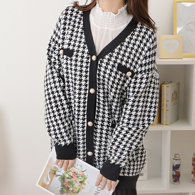 ボタン付き千鳥格子柄ジャケットライクカーディガン 女性 レディース トップス 羽織り 秋 冬 クラシカル 上品 レディ オフィス デート 体型カバー 長め ロング丈 メタリック ゴールド ビジュー ビッグボタン アクセント 華やか