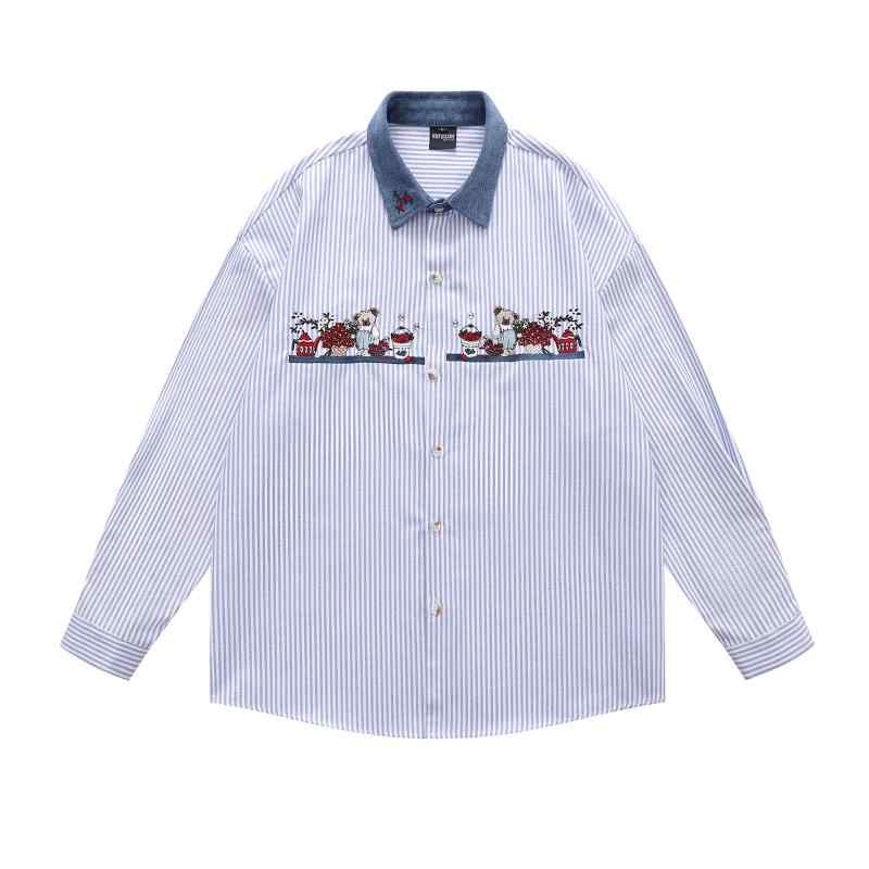 ・カテゴリ: シャツ・主な素材: 綿65%・糸番手: 30番手・スタイル: アメリカンヴィンテージ・タイプ: プルオーバー・フィット: ルーズフィット・ネックライン: 襟付き・袖丈: 長袖・柄: ストライプ・ディテール: 刺繍・シーン: カジュアル・カラー展開: ブルー、レッド、ダークグレー・サイズ展開: M、L、XL・性別: メンズ