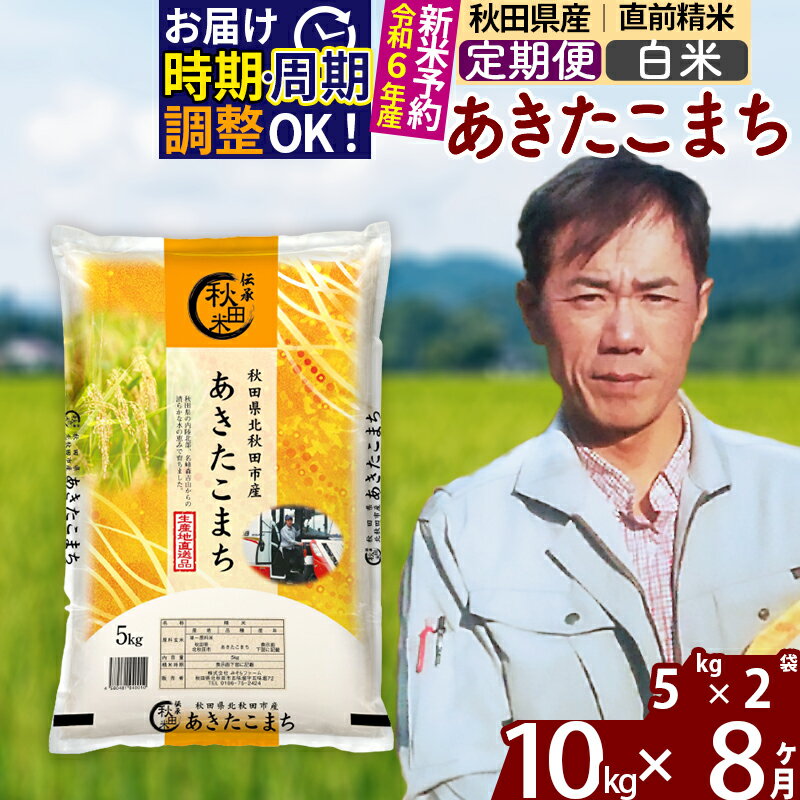★お届け時期が選べる♪ (詳細は■■*1*■■を確認) ★お届け周期を選べる「定期便」 (詳細は■■*2*■■を確認) ★お届け時期の延長サービスもございます! (詳細は■■*3*■■を確認) ★令和7年産(2025年産) ★精米したてをお届け! ★和食にぴったり。王道の「あきたこまち」 ※※こちらの返礼品は、令和7年産(2025年産)の新米です※※ (令和6年産(2024年産)のお米の受付は終了しております) ◆あきたこまち 「コシヒカリ」を親に持つ「あきたこまち」は、粒感があり、粘りはやや弱めであっさりとした味わい。 冷めてもおいしいお米なので、おにぎり、お弁当にも向きます。 ■定期便について ---- 初回は、ページ記載の配送時期通りに発送します。 2回目以降は、毎月同時期頃に発送いたします。 ■■*1*■■ お届け開始時期のご希望がある方へ お申込み時、ご希望の開始時期をお選びいただけます(半年後までの旬)。 例)2月上旬 ■■*2*■■ お届け周期の調整について お申込み時にプルダウンからお選びいただけます。 ■■*3*■■ お届け時期の延長サービスについて 定期便1回目をお受け取り後、定期便最終回のお届けまでの間で「合計6ヶ月まで」お届け時期の延長が可能でございます。 下記項目をご記載の上、ショップへの問合せ機能、またはメールにてご連絡ください。 ・寄附者様お名前(姓名) ・お申し込みサイト名 ・注文番号 ・ご希望の内容(次回配送のご希望時期/周期など) ※※時期・周期調整に関するご案内※※ 返礼品詳細 名称 精米(白米) 内容量 10kg (5kg×2袋)×8回 産地名 秋田県 品種 あきたこまち 産年 令和7年(2025年) ※毎年秋頃、新米収穫後に自動で新米に切り替わります。 使用割合 単一原料米 精米年月日 発送直前 ※発送まで数日要する場合もございます。 おいしくお召し上がりいただく目安 夏:2週間程度 冬:1ヶ月程度 お米は生鮮食品です。 密閉容器に入れて、冷蔵庫での保管がオススメです。 注意事項 ・パッケージは予告なく変更になる場合がございます。 ・定期便期間中に運送会社が変更になる場合がございます。 ・複数個口でのお届けの場合、稀に同時のお届けとならない場合がございます。 ・天候や災害等の影響によりお選びいただいた返礼品のご用意が困難となった場合、当市と事業者にて協議の上、代替案をご提案する可能性がございます。 ※ふるさと納税(寄附申込み)のキャンセル、返礼品の変更・返品はお受けできません。あらかじめご了承ください。 提供元 株式会社みそらファーム 配送温度帯 常温 ・寄附申込みのキャンセル、返礼品の変更・返品はできません。あらかじめご了承ください ・ふるさと納税よくある質問はこちら