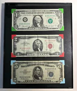 3 紙幣シールと額面タイプ セット: $1 グリーン シール、$2 レッド シール、$5 ブルー シール