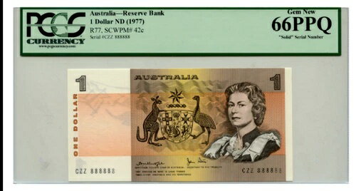 1977年(ND) オーストラリア準備銀行 1ドル P-42c ソリッド 888888 「ナイト&ストーン」 PCGS 66