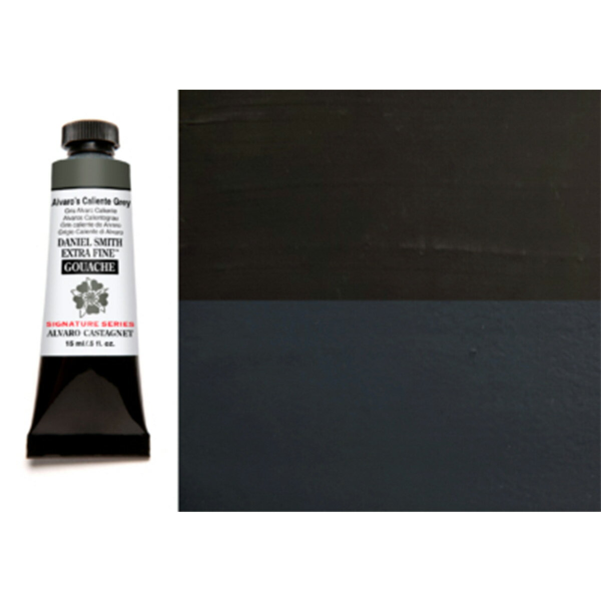 Alvaro's Caliente Grey 15ml Tube - DANIEL SMITH Gouache SKU: 284690080 Pigment: PBr 7, PB 29, PBk 6 | Series: 2 Lightfastness: I - Excellent Transparency: Opaque Staining: 2-Low Staining Part of our Signature Series, Alvaro’s Caliente Grey is a smooth, velvety grey that mixes wonderfully with other colors to tone them down and add warmth. Gouache swatches are painted in two sections. The top is mass tone straight from the tube and the bottom is mixed 1:1:1 with paint, water and Titanium White.
