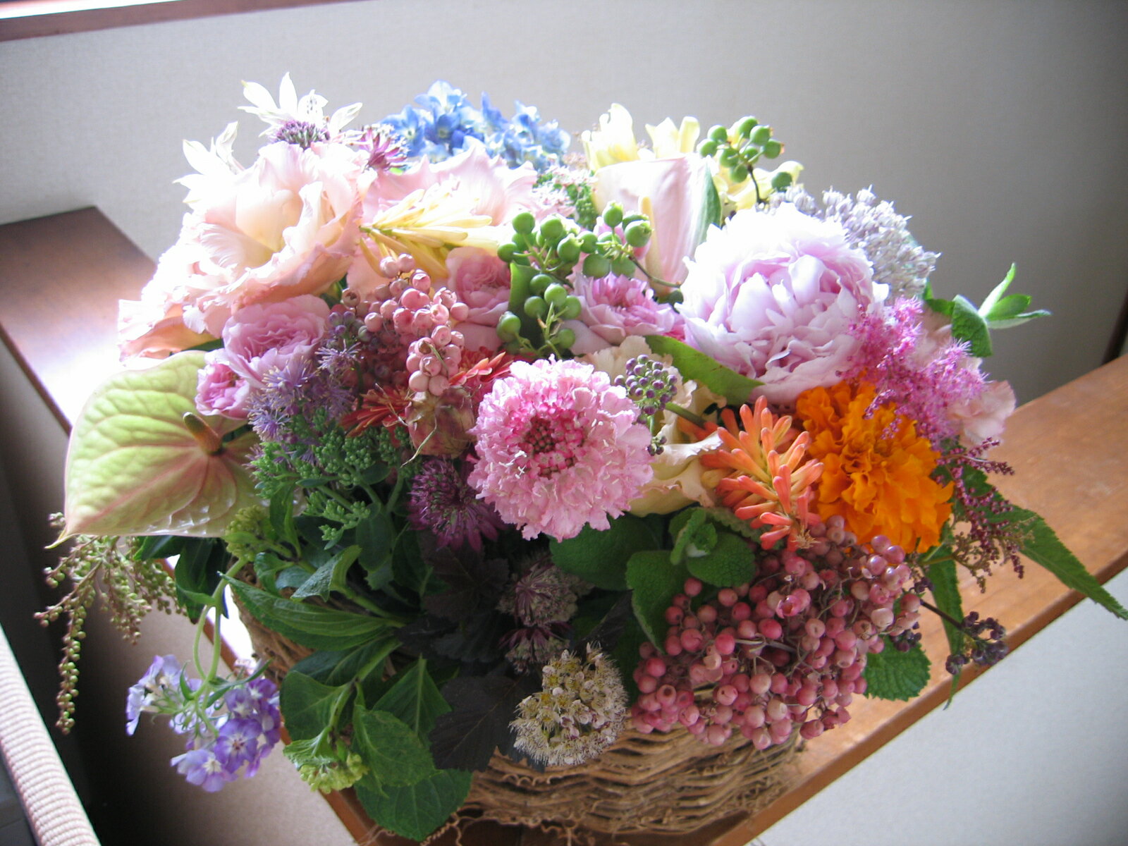 ●詳細について・・・ ■ 形 態 アレンジメント ■ サ イ ズ 約40cm×40cm×20cm ■ 花 材 季節のお花たっぷり・グリーン ■ 器の素材・ラッピング等 バスケット※器の上からも包装(ラッピング致します) ■ ご 用 途 お誕生日・記念日・ビジネス・お祝い・出産祝い・歓送迎 ●ご注意 市場の状況により花材や花器が多少変更になる場合がございます。予めご了承ください。 For the special gift... ■メッセージカードも♪ ■お手入れカードも♪ ■持ち歩き用の紙袋も♪ ご希望で当店がご用意いたしましたメッセージカードを無料で同封いたします。注文フォーム上でお選びください。 アレンジメント・お花束・プリザーブドフラワー・鉢物をご購入いただいたお客様には、簡単なお手入れ方法をご説明したメモを同封しております。 お届け後、お持ち歩きをされるお客様には紙袋をご用意いたしております。注文フォーム備考欄へご要望ください。 ★このアイテムのご感想をお聞かせください。 お客様のお声を大切な参考とさせていただきます。!! (こちらをクリックしてください。) The style of gift... ■このような荷姿でお届けいたします♪ ■お花はこのように入っています。 ■ 大切に丈夫な箱でお届けします ■陶器の器が割れないように・・・ 陶器の器の場合は割れ防止の梱包材でお包みしてからその上にラッピングいたしております。 ■お花を冷気からお守りするために・・・ 夏季のクール便使用時期は、(冬季の凍結のおそれのある場合も利用いたします。)ラッピングの上からふんわりとお花全体を直接冷気からお守りする梱包を行っております。