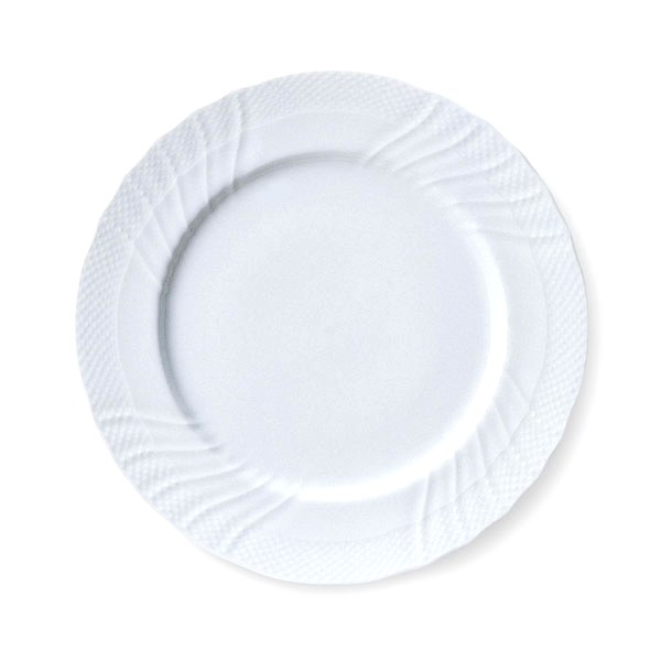 特白磁の白いデザート皿。業務用にもぴったり。直径20.9cm、高さ2.3cm。電子レンジOK、食器洗浄機OK。材質/磁器。日本製。 リム部分の拡大。 上品な波模様がまわりに施されています。アンジェ デザート皿<白い業務用食器>