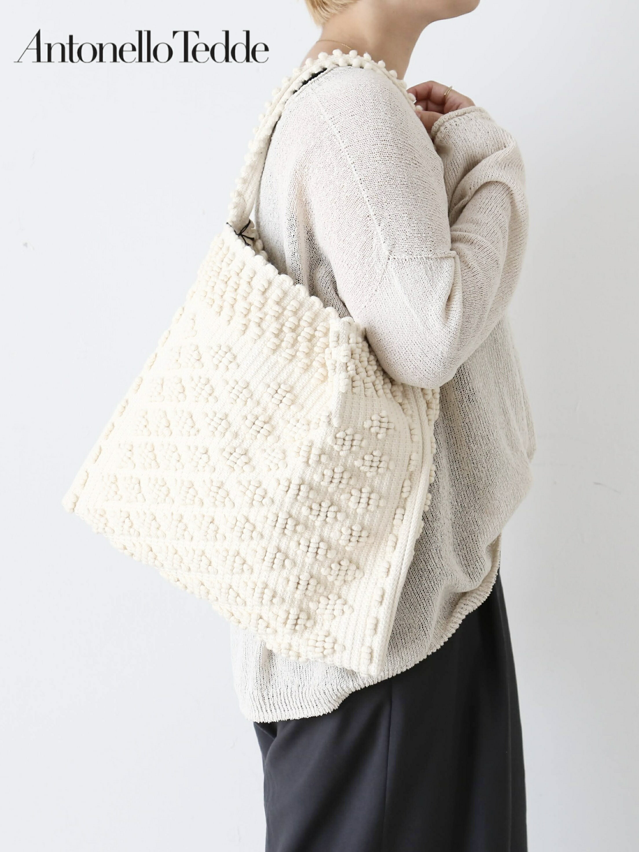 丸い粒のような刺繍が施されたトートバッグ イタリアでひとつひとつ丁寧に手作りで作られるバッグです。 しっかりとした生地で作られたトートバッグ 内ポケットも大きめ、マグネットボタンで留めることも可能です。 A4サイズもすっぽり収納できる大きさで、ノートパソコンも入るので、働く女性に持ってこいなバッグ。 ちょっとしたお出かけや習い事のバッグとしてもお使いいただけます。 内ポケットは二つ。 ロゴ入り保存袋付き ANTONELLO TEDDE(アントネッロ・テッデ) マリポサ メッド ロンビ フラットバッグ [AT COTTON 100] 色:クリーム/ブラック 素材:コットン100% サイズ:Fサイズ W39cm×H34cm ハンドル56cm *平置き寸法です。 多少の誤差はご容赦くださいませ。 こちらの商品は店頭にて同時に販売しております。 ご注文いただいた後に在庫状況を確認いたしますが「在庫切れ」の場合がございます。 その際はメールにてご連絡いたしますので、何卒ご了承ください。
