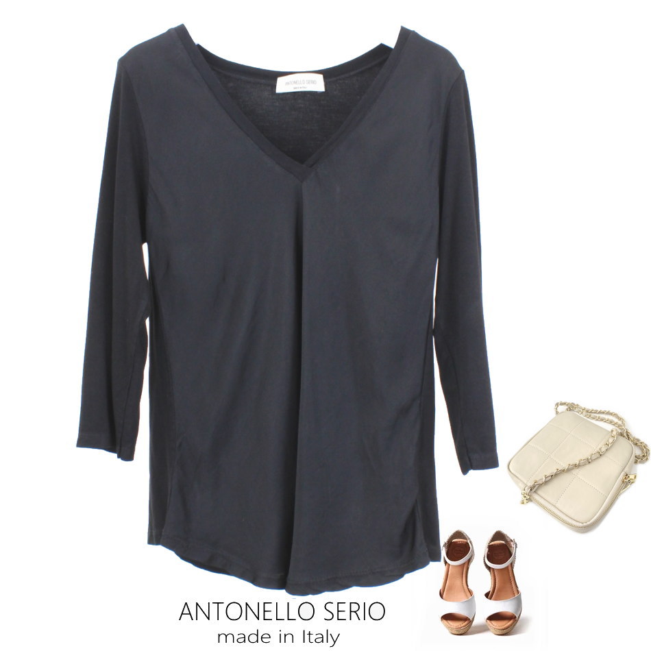 イタリアブランド ANTONELLO SERIOの 肌ざわりバツグンのビスコースベースにマットサテンを 組み合わせた、優しい肌ざわりのVネックカットソー。 上品な光沢感を持つマットサテンは目立ちすぎず、 適度な光り感が愉しめます。 カーディガンやジャケットのインにももちろん 1枚でデニムに合わせればカジュアルスタイルにも! ■コーディネートしたバッグ ワンサイズ 脇幅44cm 着丈 60cm 肩幅38cm 袖 44cm程度(8部袖) 伸縮性のある素材です。 ストレッチ性のある素材で身幅は伸縮します。 ※製品により5%前後の誤差が生じます。ご了承ください。 ■製品の本体に見られる色斑はデザインによるものです また畳んだ状態でついた跡などがみられますが お洗濯によって消えてまいります。ご了承ください ■素材■ ビスコース85% シルク SETA10% エラスタン5% お品物により表示にビスコース95%エラスタン5% と記載のあるものがございます。 ■イタリア製 イタリアANTONELLO SERIO AJMの製品です ■お手入れはドライクリーニング、手洗い、 もしくは洗濯機でネットにいれてのデリケートコースで お洗濯をおすすめします。 ■こちらの製品はイタリアの素材を使用し イタリアにて縫製されたものです。 日本のような厳密な検品がスタンダードではないイタリアでは 多少の縫製のゆがみ等が見られるものも製品化されております。 このような点を措いても、イタリアのデザインの良さや優れたカッティングは 日本には見られないものが多々ございますため、あえてインポートをしております。 ご理解のうえご注文をお願いします。イタリアブランド ANTONELLO SERIOの 肌ざわりバツグンのビスコースベースにマットサテンを 組み合わせた、優しい肌ざわりのVネックカットソー。 上品な光沢感を持つマットサテンは目立ちすぎず、 適度な光り感が愉しめます。 カーディガンやジャケットのインにももちろん 1枚でデニムに合わせればカジュアルスタイルにも! ■コーディネートしたバッグ