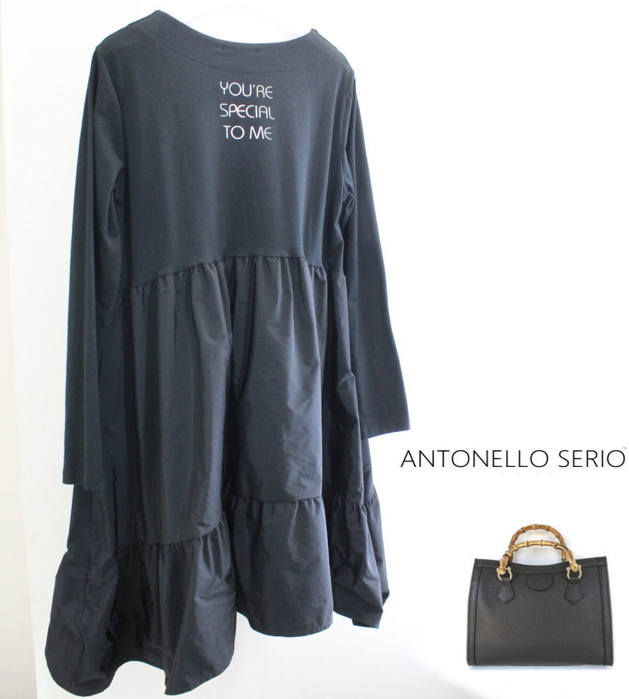 イタリアブランド ANTONELLO SERIOの コットン&タフタコンビ素材 ハイウエストワンピース。 チュニックとしても着こなせる、Aラインのシルエットが フェミニンなデザインです。 シンプルでタイトなコットンストレッチのトップスに ふんわり段デザインのアシンメトリスカート部分をあしらった キュートなデザイン。 スニーカーにも合うカジュアル&シックな1枚。 バックスタイルのメッセージプリントが効いています。 ■コーディネートしたバッグ ワンサイズ 肩幅41 脇幅47cm 着丈90cm 伸縮性のある素材です。 ストレッチ性のある素材で身幅は伸縮します。 ※製品により5%前後の誤差が生じます。ご了承ください。 ■素材■ トップス部分 コットン90 エラスタン10% タフタ: ポリエステル100% ■イタリア製 イタリアANTONELLO SERIO AJMの製品です ■お手入れはドライクリーニング、手洗い、 もしくは洗濯機でネットにいれてのデリケートコースで お洗濯をおすすめします。 ■こちらの製品はイタリアの素材を使用し イタリアにて縫製されたものです。 日本のような厳密な検品がスタンダードではないイタリアでは 多少の縫製のゆがみ等が見られるものも製品化されております。 このような点を措いても、イタリアのデザインの良さや優れたカッティングは 日本には見られないものが多々ございますため、あえてインポートをしております。 ご理解のうえご注文をお願いします。イタリアブランド ANTONELLO SERIOの コットン&タフタコンビ素材 ハイウエストワンピース。 チュニックとしても着こなせる、Aラインのシルエットが フェミニンなデザインです。 シンプルでタイトなコットンストレッチのトップスに ふんわり段デザインのアシンメトリスカート部分をあしらった キュートなデザイン。 スニーカーにも合うカジュアル&シックな1枚。 バックスタイルのメッセージプリントが効いています。 ■コーディネートしたバッグ