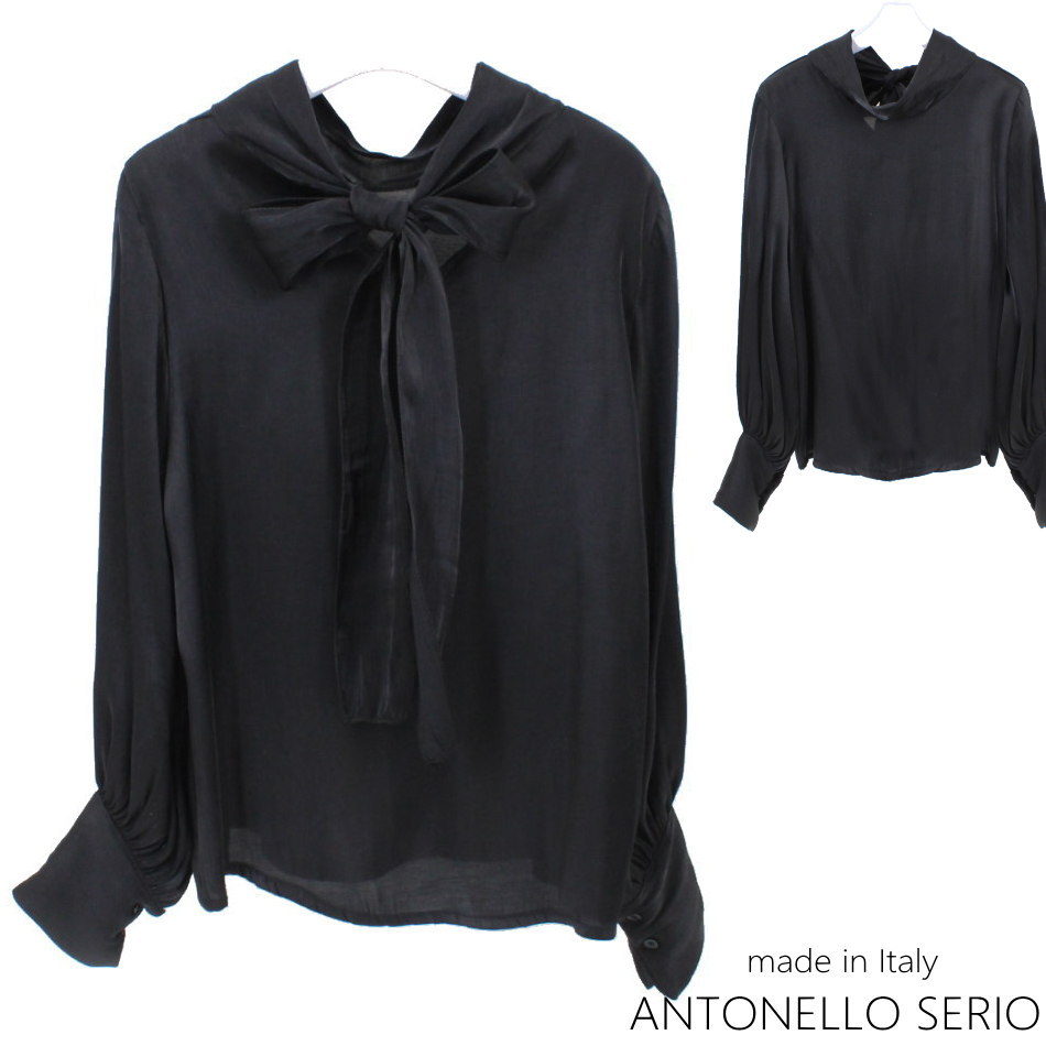 【ネコポス発送】【イタリア直輸入】【よりどり3個以上で各200円引き】イタリア製ANTONELLO SERIOシルキーマットサテン 半開オーバーブルーザ オーバーブラウス ロールネック 後ろリボン 【21A】92P83211 01P81044