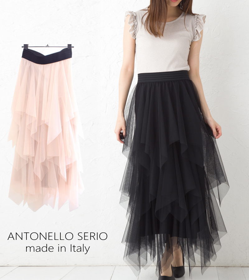 【イタリア製 スカート】イタリア製ANTONELLO SERIO ビスコースストレッチ&チュール素材 レディース チュール スカート アシンメトリカット シースルー ダンス 【20B】【MP】91P83378 9