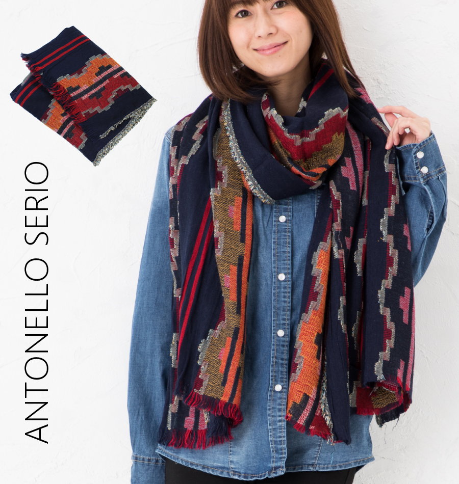 【定形外郵便】【イタリア直輸入】【よりどり3個以上で各200円引き】イタリア ANTONELLO SERIO ビスコース コットン ジャガード織り ネイティブ柄 大判ストール 秋色ストール レディース 温度調節 92E56429-BL