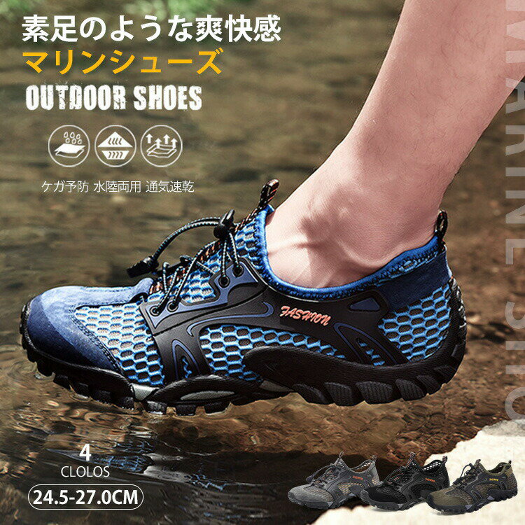 主な特徴*快適さを上げるマリンシューズ普通のシューズと比べて滑りにくさや速乾性に優れて、川や海など水辺でのアクティビティを快適に楽しめる、水陸両用シューズです。*容易に着脱が可能弾力がある紐とアジャスター付き足の快適さに合わせて簡単に調節できます。*水抜きされやすく、速乾性に秀でた2重メッシュ素材を採用2種類のメッシュを重ねているため小石などが入りにくく快適*通気性と速乾性に優れた軽量メッシュアッパー夏に嬉しいムレ知らずのメッシュ素材軽量 通気 ムレ防止 速乾*安定ヒールカップ設計かかとのような形で立体的に製作されたパーツが足をしっかり固定させ、ねじれにくくなるようサポートします。?地面を立体的に感じられ、安全性も確保?厚みのあるソールで足裏の怪我を防ぎやすい?安定性が高く、カカトのズレも防止できるマリンシューズ ウォーターシューズ メンズ スニーカー 水陸両用 大きいサイズ ランニング アクア ヨガシューズ ジムシューズ 軽量 通気 排水機能 ケガ予防 激しい動きにも対応通気性のいい弾力メッシュマリンシューズ ウォーターシューズ メンズ スニーカー 水陸両用 大きいサイズ ランニング アクア ヨガシューズ ジムシューズ 軽量 通気 排水機能 ケガ予防 激しい動きにも対応通気性のいい弾力メッシュメーカー希望小売価格はメーカーカタログに基づいて掲載しています