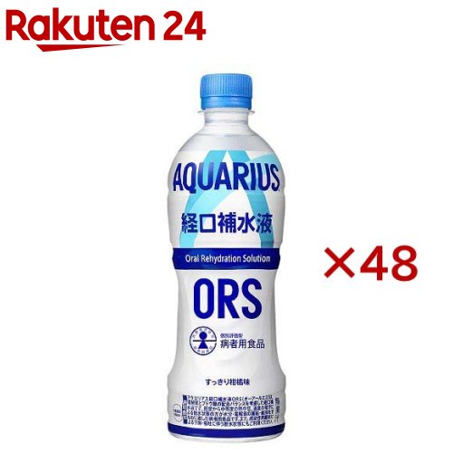お店TOP>健康食品>特別用途食品>病者用食品>個別評価型>アクエリアス 経口補水液 ORS (24本×2セット(1本500ml))商品区分:病者用食品(特別用途食品)【アクエリアス 経口補水液 ORSの商品詳細】●コカ・コーラシステムの消費者庁許可×個別評価型病者用食品(軽度〜中等度の熱中症、過度の発汗による脱水状態の方に適する)●アクエリアスならではのすっきりした飲みやすい味わい●シンプルで手に取りやすいパッケージデザイン【保健機能食品表示】許可表示:アクエリアス 経口補水液ORS(オーアールエス)」は、電解質とブドウ糖の配合バランスを考慮した経口補水液です。病者用食品として表示許可を得た本製品は、軽度から中等度の熱中症、過度の発汗による脱水状態の方が水分・電解質の補給・維持をするのに適しているほか、感染性胃腸炎による下痢・嘔吐に伴う脱水状態にも利用できます。【品名・名称】経口補水液(個別評価型)【アクエリアス 経口補水液 ORSの原材料】糖類(ブドウ糖(国内製造)、果糖)、食塩/クエン酸、塩化K、クエン酸Na、香料、甘味料(スクラロース)【栄養成分】(100mlあたり)エネルギー 11kcal、たんぱく質 0g、脂質 0g、炭水化物 2.7g、食塩相当量 0.249g、ナトリウム 98mg、カリウム 80mg、塩素 169.4mg、ブドウ糖 1.5g(その他)モル濃度比(ナトリウム:ブドウ糖)1:2、浸透圧263mOsm/kg、Na+43mEq/L、K+21mEq/L、Cl-48mEq/L、ブドウ糖1.5%【アレルギー物質】記載なし【保存方法】高温・直射日光をさけてください【注意事項】・食事療法の素材として適するものであり、多く摂取することによって疾病が治癒するものではありません。・医師・薬剤師・看護師・管理業養士・登録販売者等の専門家の指導に基づいて使用してください・経口補水液は、電解質の濃度が高めの、糖を含む清涼飲料水です。ナトリウム、カリウムや糖質等の摂取制限をされている方が飲用される際は、必ず医師と相談し、指導に沿って使用してください。・下記の1 日当たりの目安量を参考に脱水状態に合わせて適宜増減してお飲みください。学童〜成人(高齢者を含む):500ml〜1000ml・医師から次の状態時の食事療法として指示された場合に限りお飲みください。-軽度から中等度の熱中症-過度の発汗による脱水状態-感染性胃腸炎による下痢・嘔吐に伴う脱水状態【原産国】日本【ブランド】アクエリアス(AQUARIUS)【発売元、製造元、輸入元又は販売元】日本コカ・コーラ※説明文は単品の内容です。リニューアルに伴い、パッケージ・内容等予告なく変更する場合がございます。予めご了承ください。・単品JAN:4902102154239日本コカ・コーラ150-0002 東京都渋谷区渋谷4-6-30120-308509広告文責:楽天グループ株式会社電話:050-5577-5043[スポーツドリンク/ブランド:アクエリアス(AQUARIUS)/]