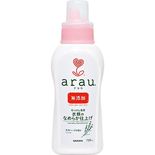 4973512308673商品サイズ (幅×奥行×高さ) :9.1×6.5×26.1cm原産国:日本内容量:720mL商品紹介●無添加と天然ハーブ配合の衣類のなめらか仕上げ剤です。●クエン酸のチカラでなめらかでやさしい仕上がりに。●衣類のふんわり感を保ちながら吸水性アップ。●黄ばみ・変色・ニオイの原因になるすすぎ残しを防ぎます。●天然ハーブ100%の香り:ラベンダー油。●合成香料、着色料、保存料無添加。●本品は、洗たく用せっけん専用のリンス剤です。「アラウ洗たく用せっけん」や「アラウ洗たく用せっけんゼラニウム」との併用をおすすめします。使用上の注意をよく読んでお使いください。【使用方法】・本品は洗たく用せっけんのすすぎ時に使用します。・柔軟剤投入口がある場合は規定量を投入口に投入します。※投入方法は洗たく機の取扱説明書を参照にしてください。・手洗いの場合は、時々かき混ぜながら3分浸し、最後に絞って干します。【使用量の目安】[全自動・二槽式(水量)]60mL (水量の目安 60L)50mL (水量の目安 50L)45mL (水量の目安 45L)30mL (水量の目安 30L)[ドラム式(洗たく物量)]30mL (洗たく物量6kg)20mL (洗たく物量3kg)[手洗い(水量)]10mL (水量の目安 10L)使用上の注意●塩素系漂白剤と絶対に混ぜないでください。有害な塩素ガスが発生し危険です。●せっけん、洗剤、漂白剤などと一緒に洗たく機に入れないでください。●原液が衣服に直接かかるとシミや変色する場合があります。かならずうすめて使用してください。●保管環境によっては白濁や香りの変化がありますが、性能上問題なくお使いいただけます。●製品の特性上、低温下で結晶を生じることがありますが、容器ごとお湯で温めていただくと元に戻ります。【使用上の注意】・用途(すすぎ時)以外に使わない。・子どもの手の届くところに置かない。・原液が直接肌に触れないようにする。・手洗いの時、手肌の弱い方や荒れ性の方は炊事用手袋を使用する。・使用後は、手を水でよく洗い、クリームなどでお手入れを。・高温や直射日光の当たる場所での保管は避ける。【応急処置】・飲み込んだ場合は水を飲ませるなどの処置をする。・目に入った場合は速やかに流水でよく洗眼する。・異常が残る時は商品を持参し専門医に相談する。原材料・成分クエン酸、水酸化カリウム、エタノール、天然精油